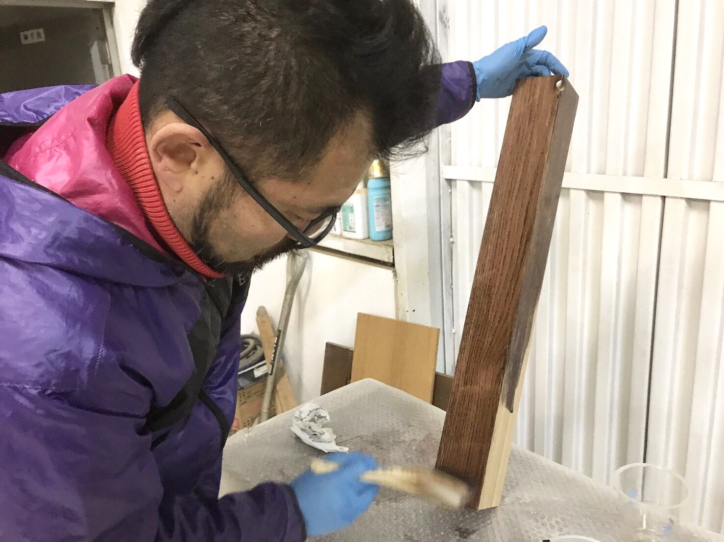 また、新しく製作した脚も、ステインで染色した後に下塗りのシーラーを塗って仕上げのウレタンを塗る・・・などいくつもの工程を踏んでいます。