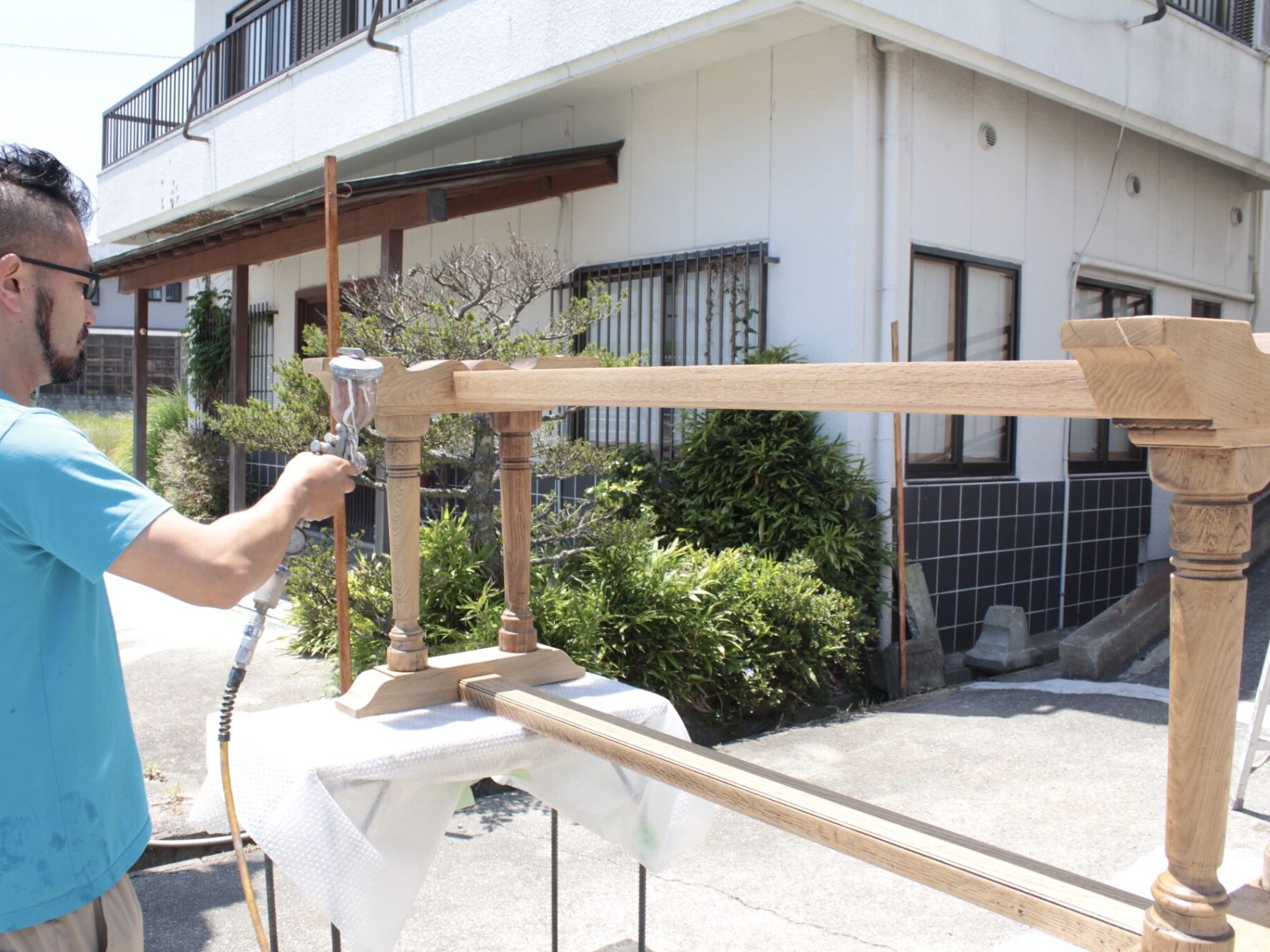 仕上げの塗装は、ウレタン塗装。ムラが出ないよう気をつけながらガンで吹いていきます。