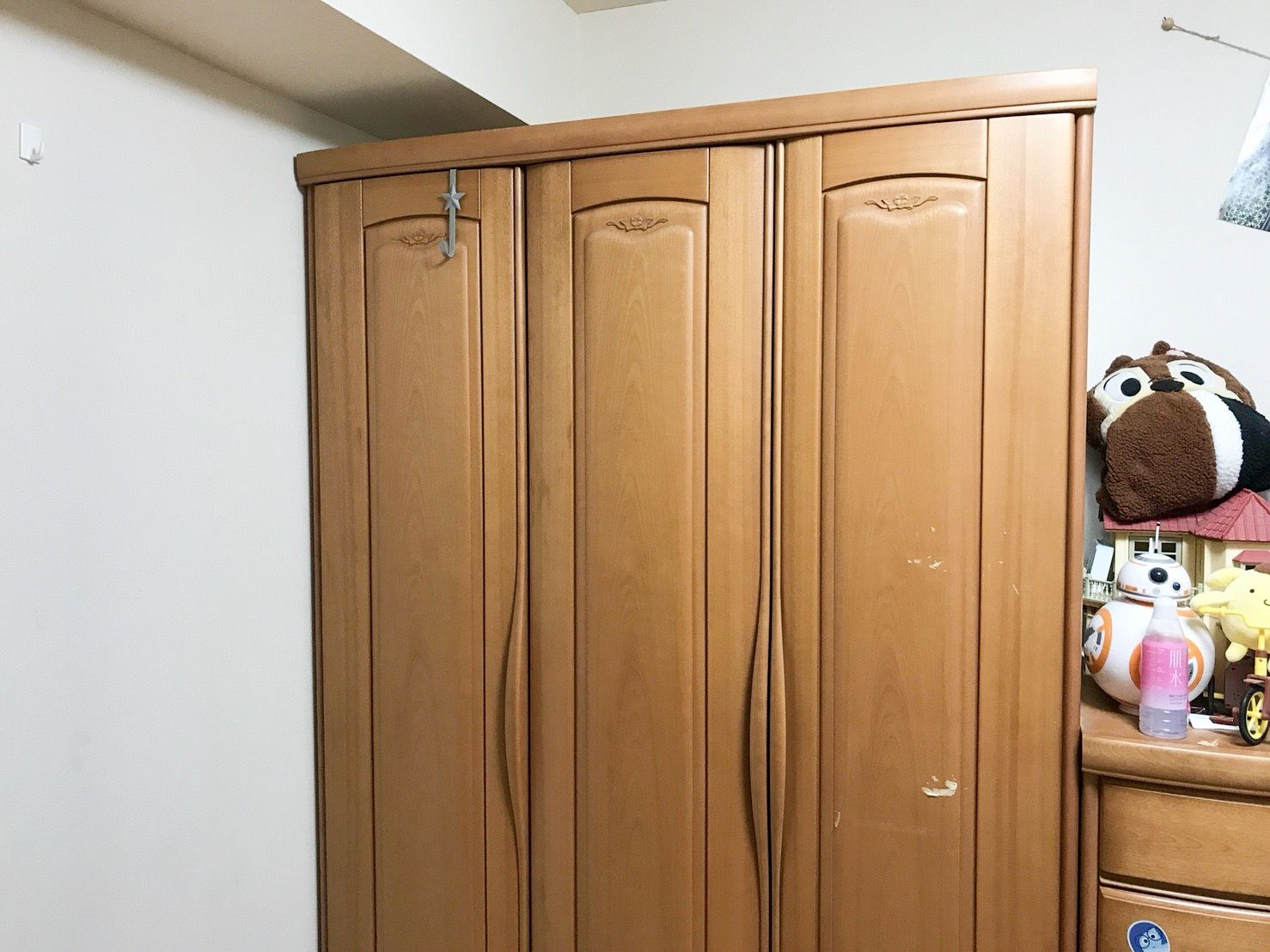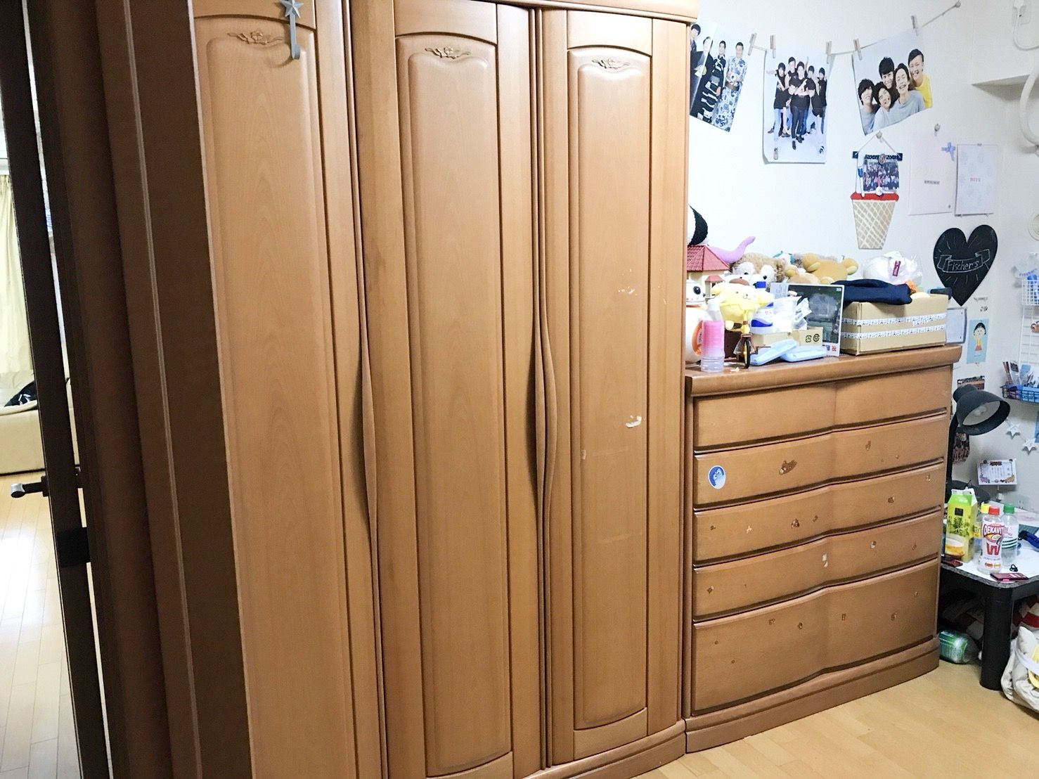 この素敵なお花の彫刻があるからこそ、高さのある洋服箪笥も、これだけ柔らかい印象に映るのかもしれません。