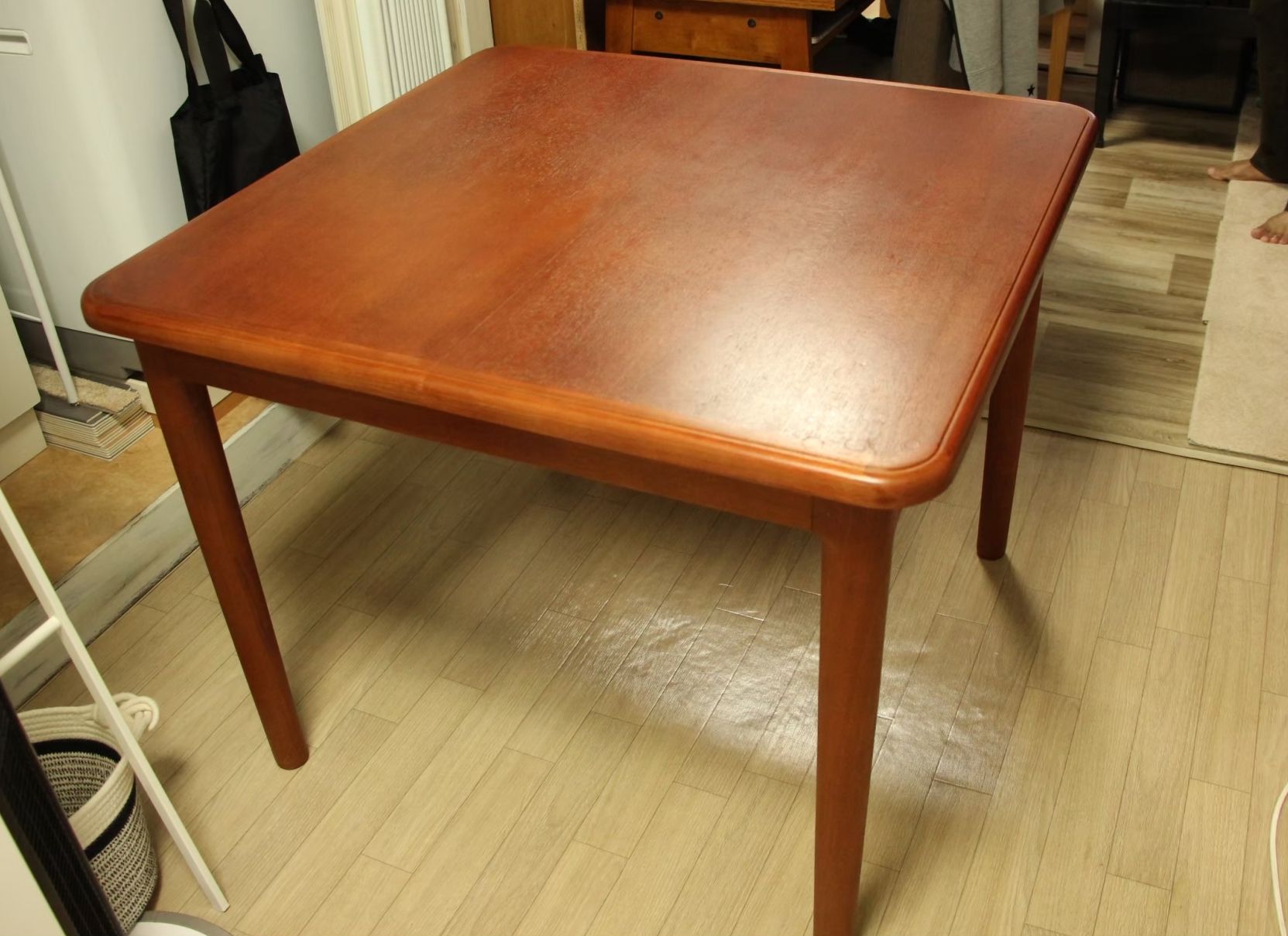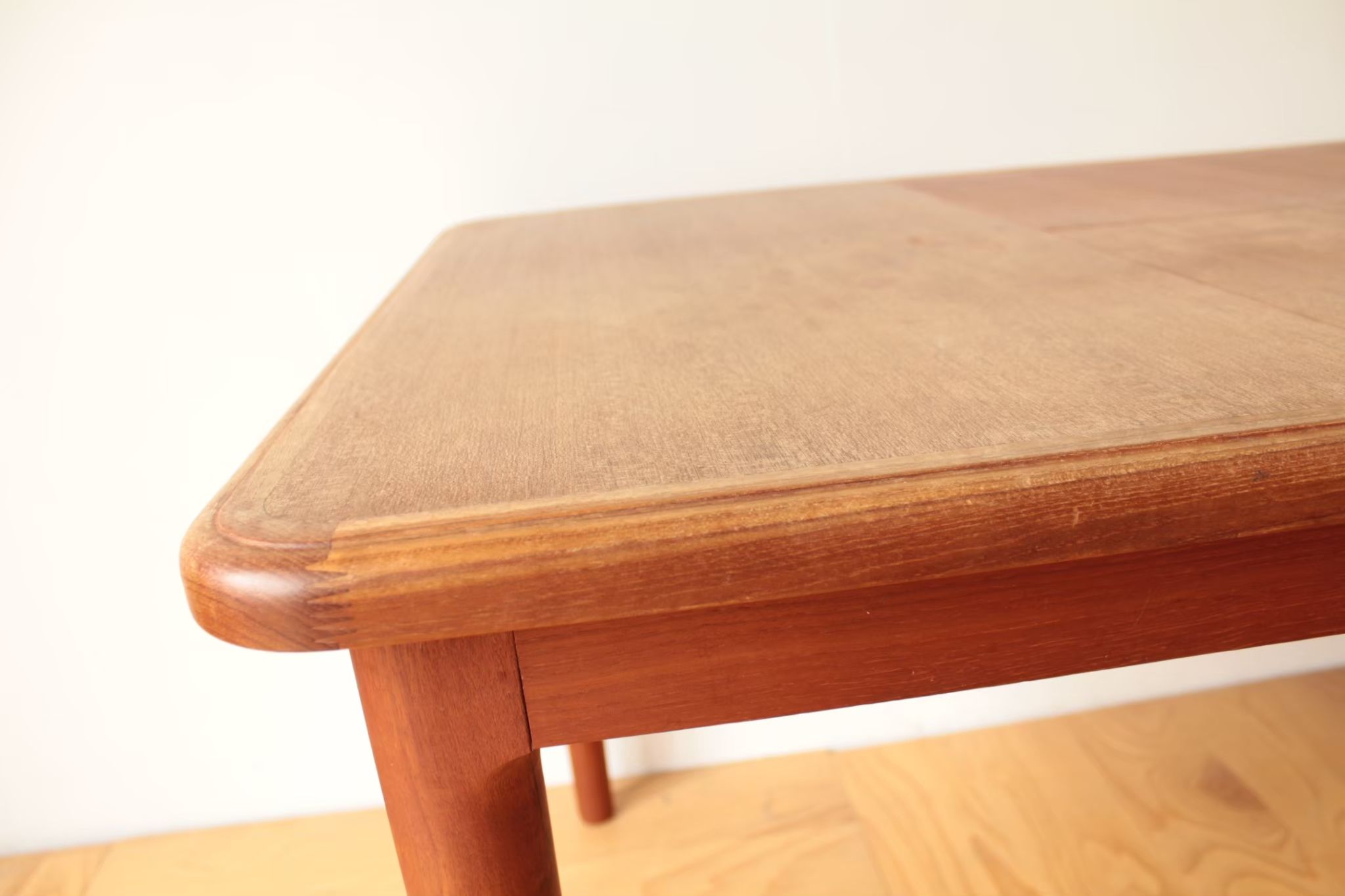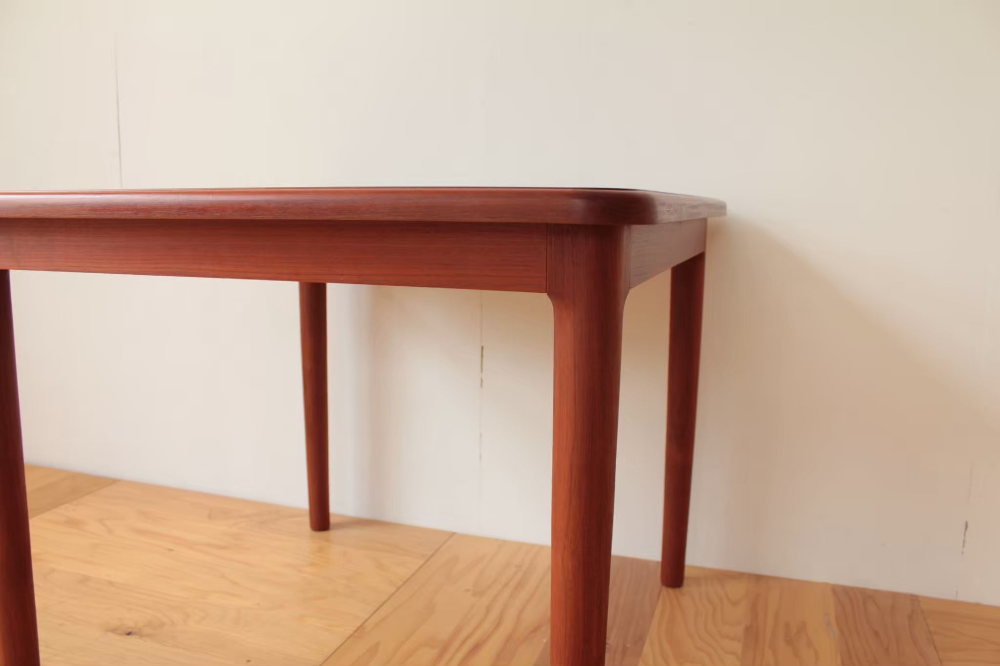 チーク材の素敵なテーブルです。お客様がご結婚される時にご両親に買ってもらったテーブルだそうで、思い出も詰まっていると仰っていました。