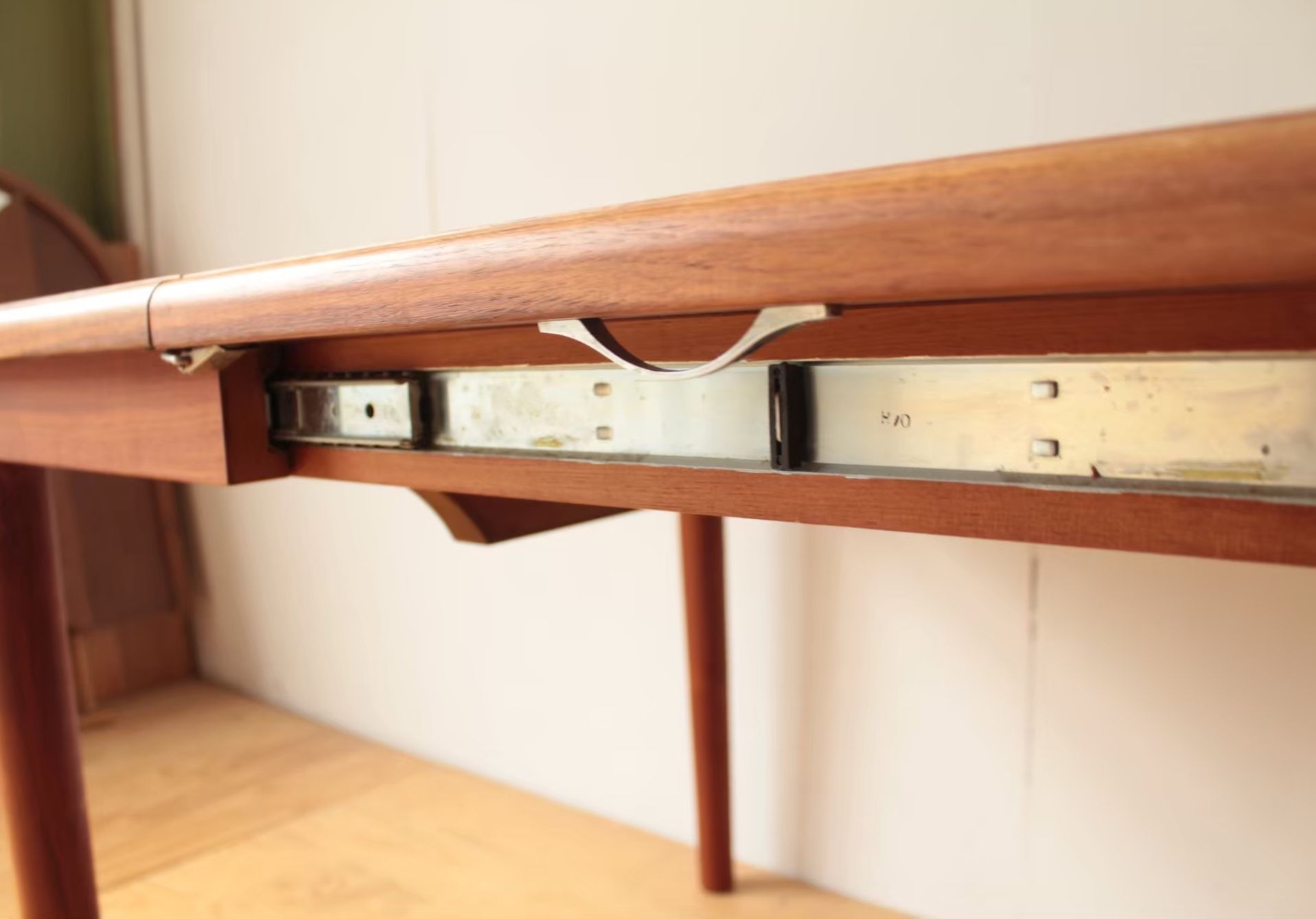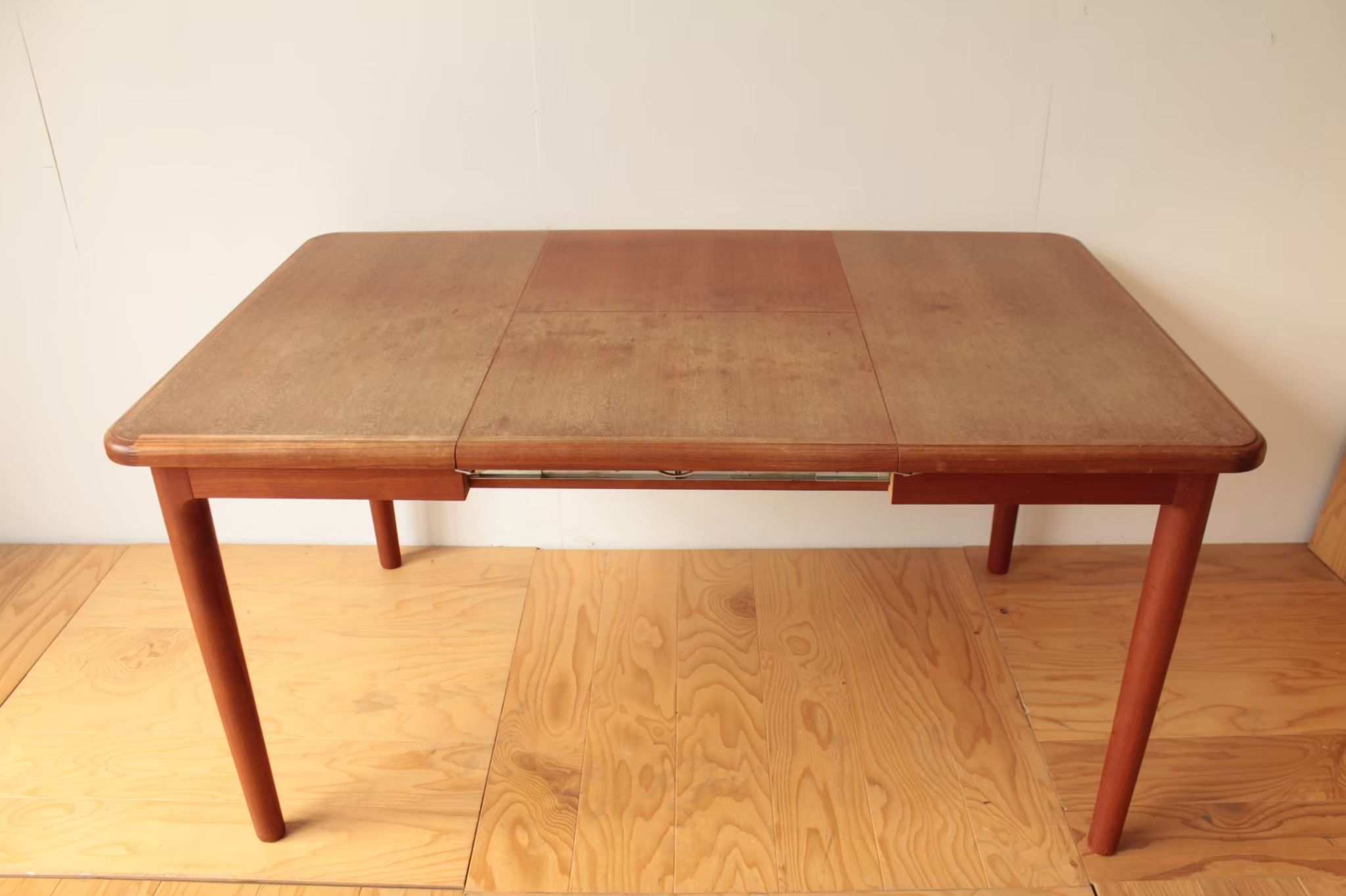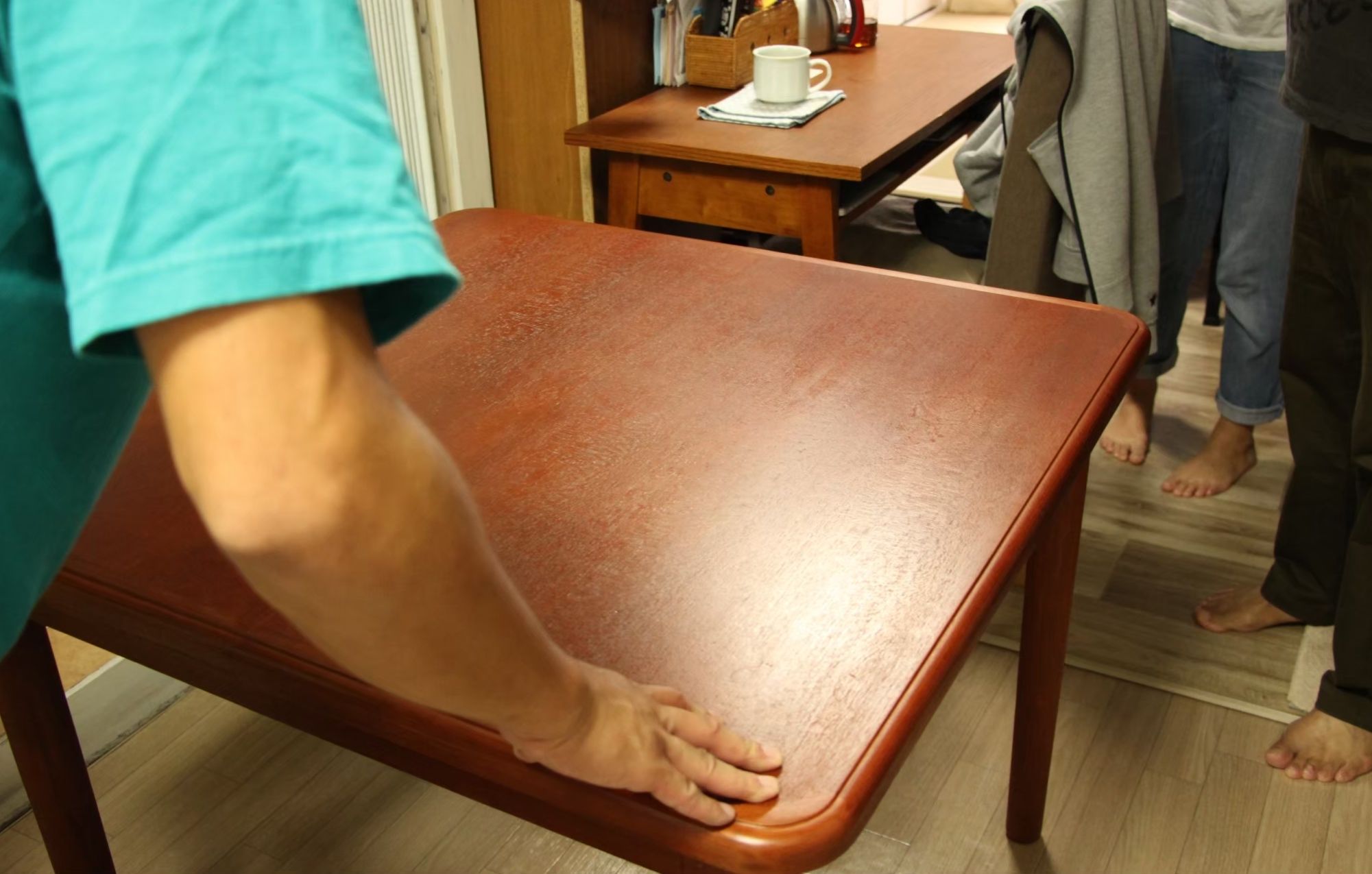 チーク材の素敵なテーブルです。お客様がご結婚される時にご両親に買ってもらったテーブルだそうで、思い出も詰まっていると仰っていました。