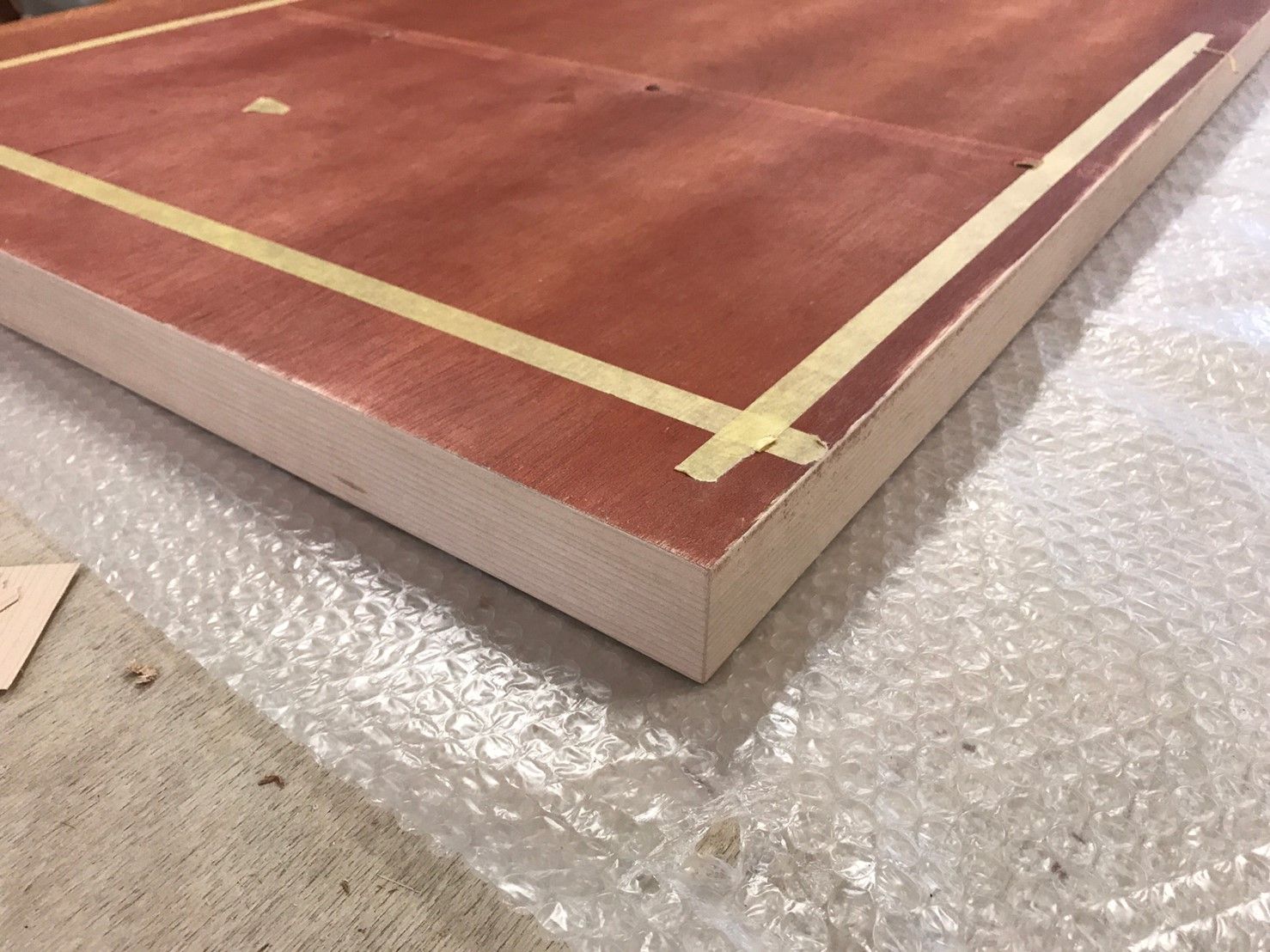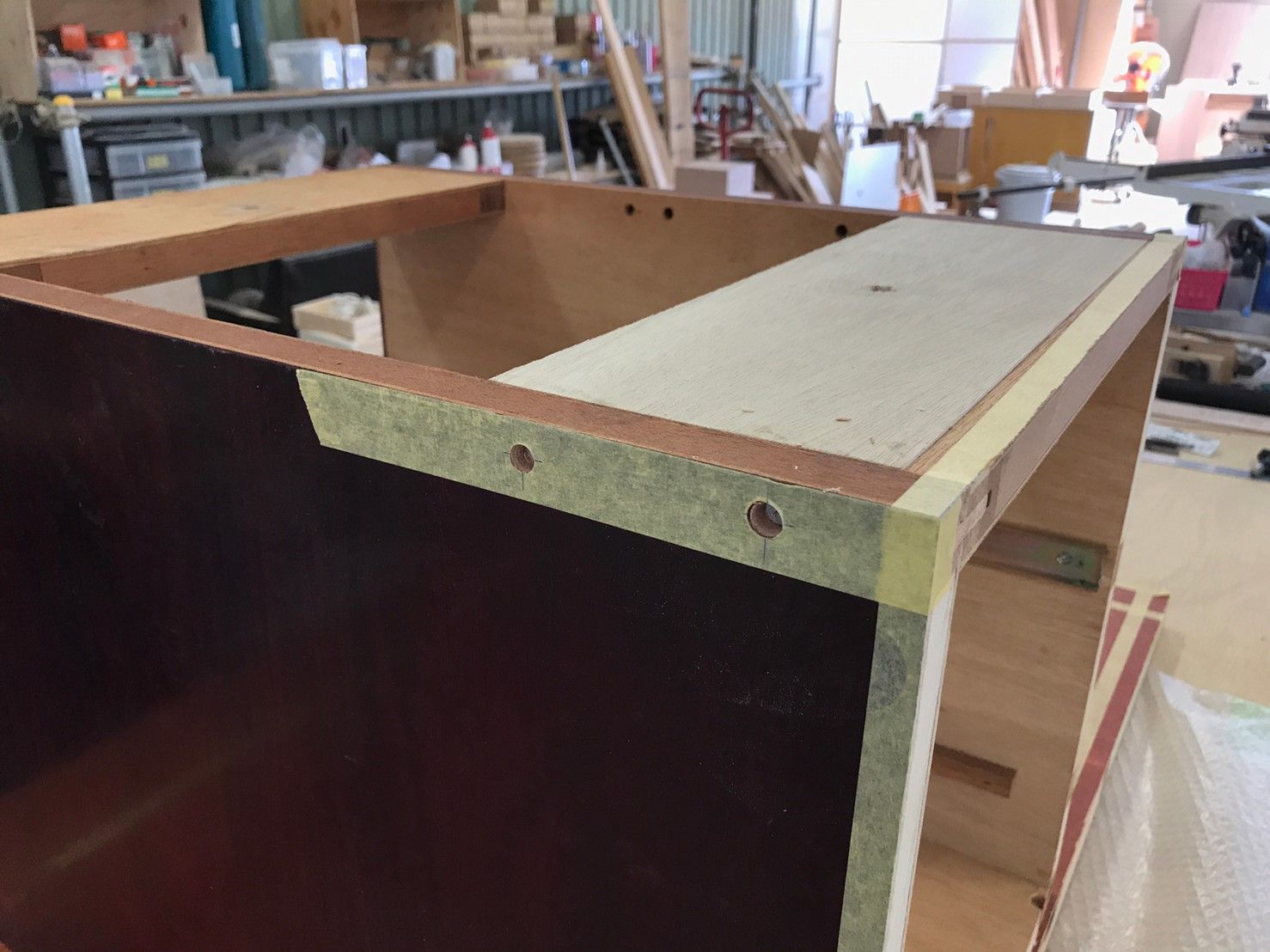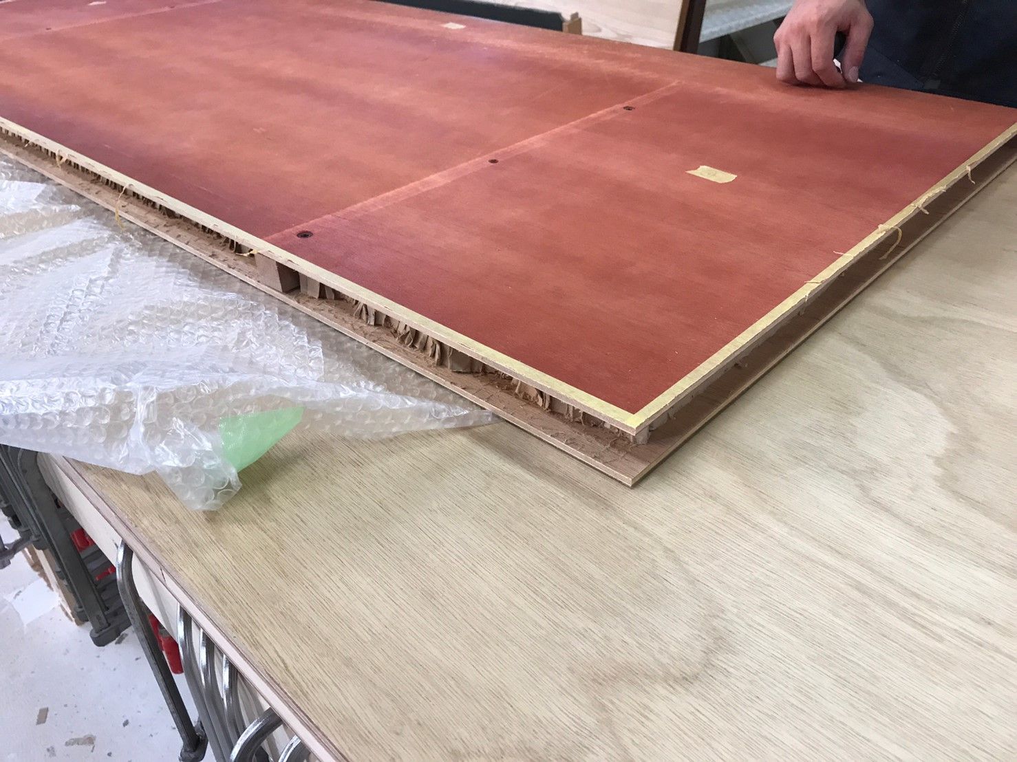今回のリメイクでは、この内部の空洞を埋めてから、チェリー材の突板で小口を仕上げます。
