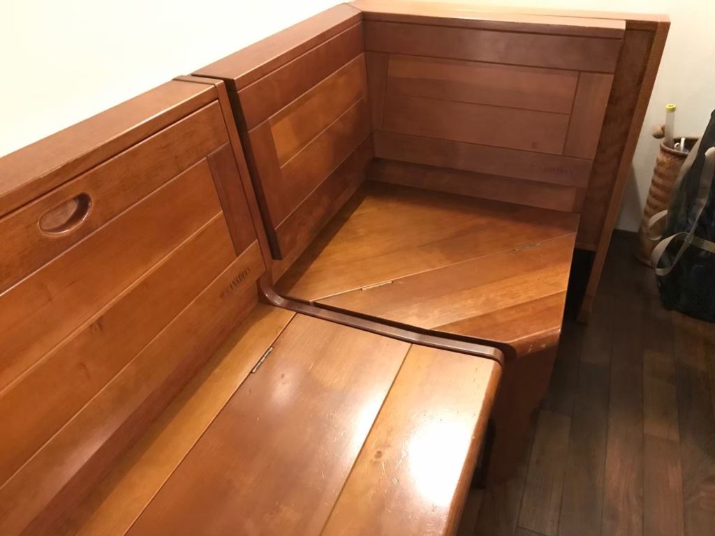 ちなみに、今回のキャビネットでは、ベンチの座面を天板兼収納のフタに、コーナーベンチの背もたれを扉に使用しました。