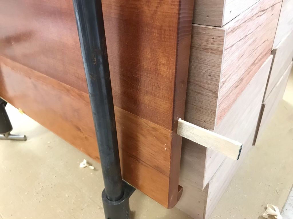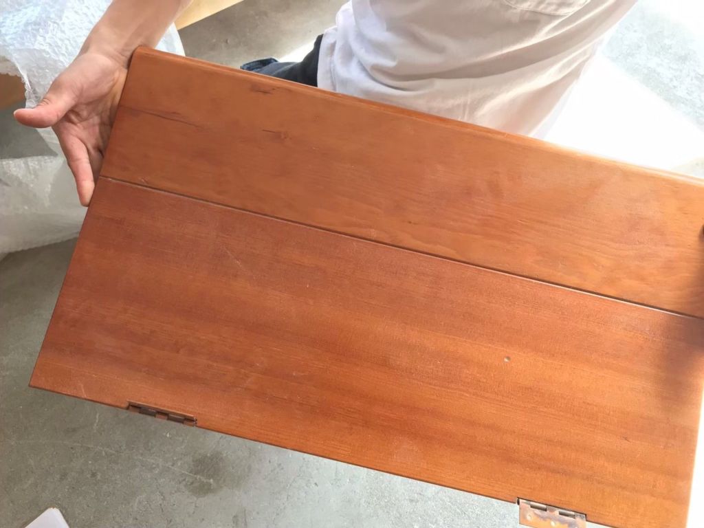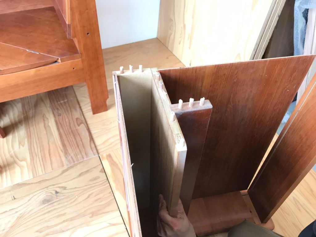 ↑の写真を見ていただくと、木材と木材を繋ぐダボが折れずに残っているのがわかるかと思います。これ、下手に分解するとダボが折れたり、それだけじゃなくリメイクに使う木材自体がひび割れたりしちゃうんです。