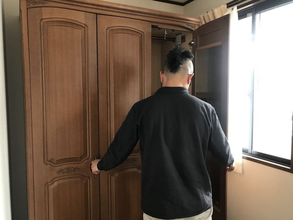 お客様のお家に到着してお二階にご案内していただくと、そこにはとても立派で婚礼家具が。素敵な洋服タンス、整理タンス、和タンスの3点セットがありました。