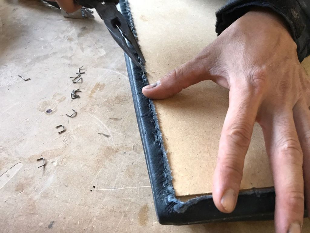座板と生地はタッカーというホッチキスのようなもので止められているんですが、座面の張り替えをするため、タッカーの針を一個一個丁寧に外し、座板と生地を分解していきます。