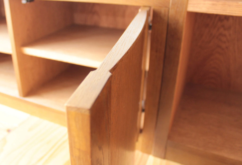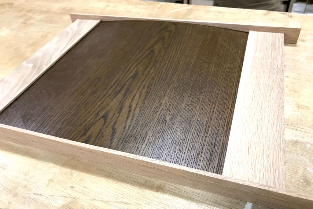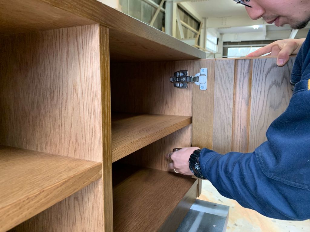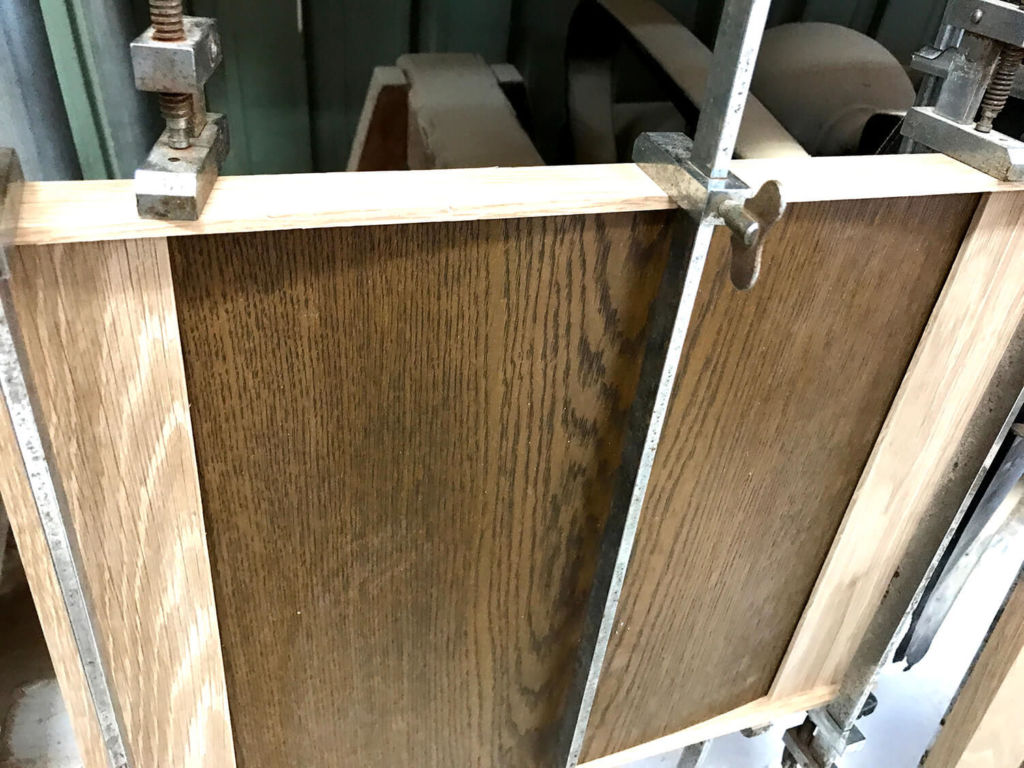 扉の左右は無垢材がはめ込まれていますが、上下は写真のように小口(カットした断面)を無垢のオーク材で覆う加工を施していきます。