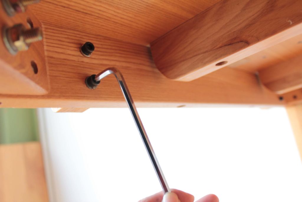 こちら、延長用天板の裏側に鬼目ナットという金具が仕込んであって、延長用天板を使わないときはこのように机の脇に収納できるようになっているんです。