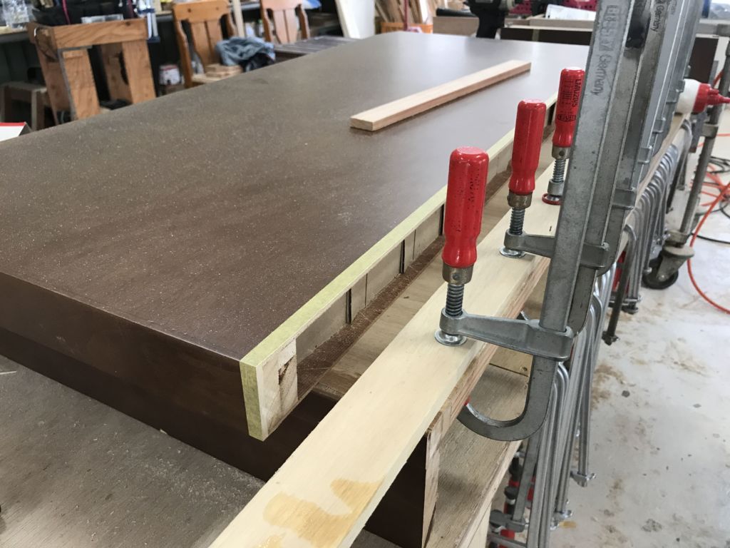 引き出しを丁寧に分解して取り出した前板を、綺麗に並べて接ぎ合せ、圧着していきます。
