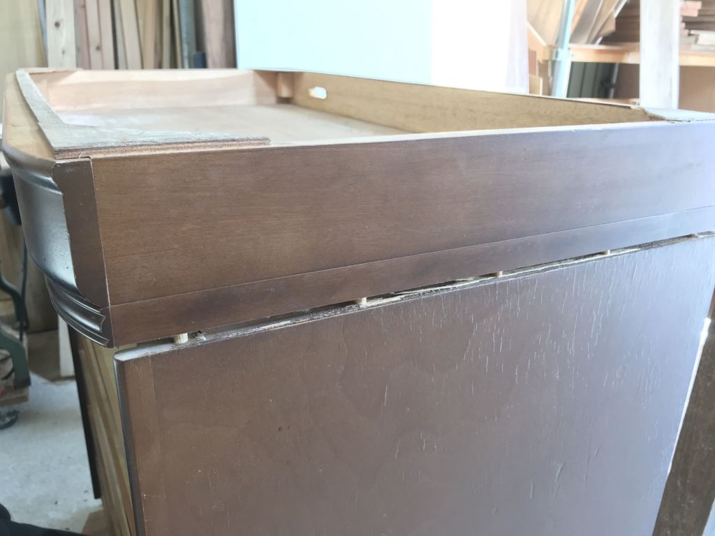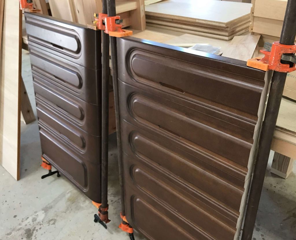 おっさんの話を聞いていると、どうやら引き出しの前板を中央でカットして、縦に接ぎ合せることで扉を作るということらしい。