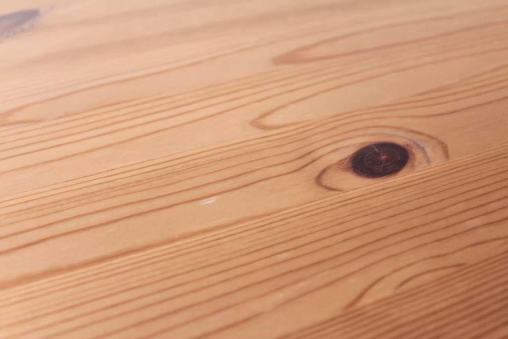 さて、お客様のテーブルには、節付きのパイン材『ポンデロッサパイン』が使われていました。