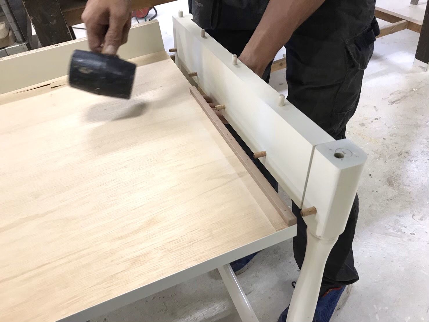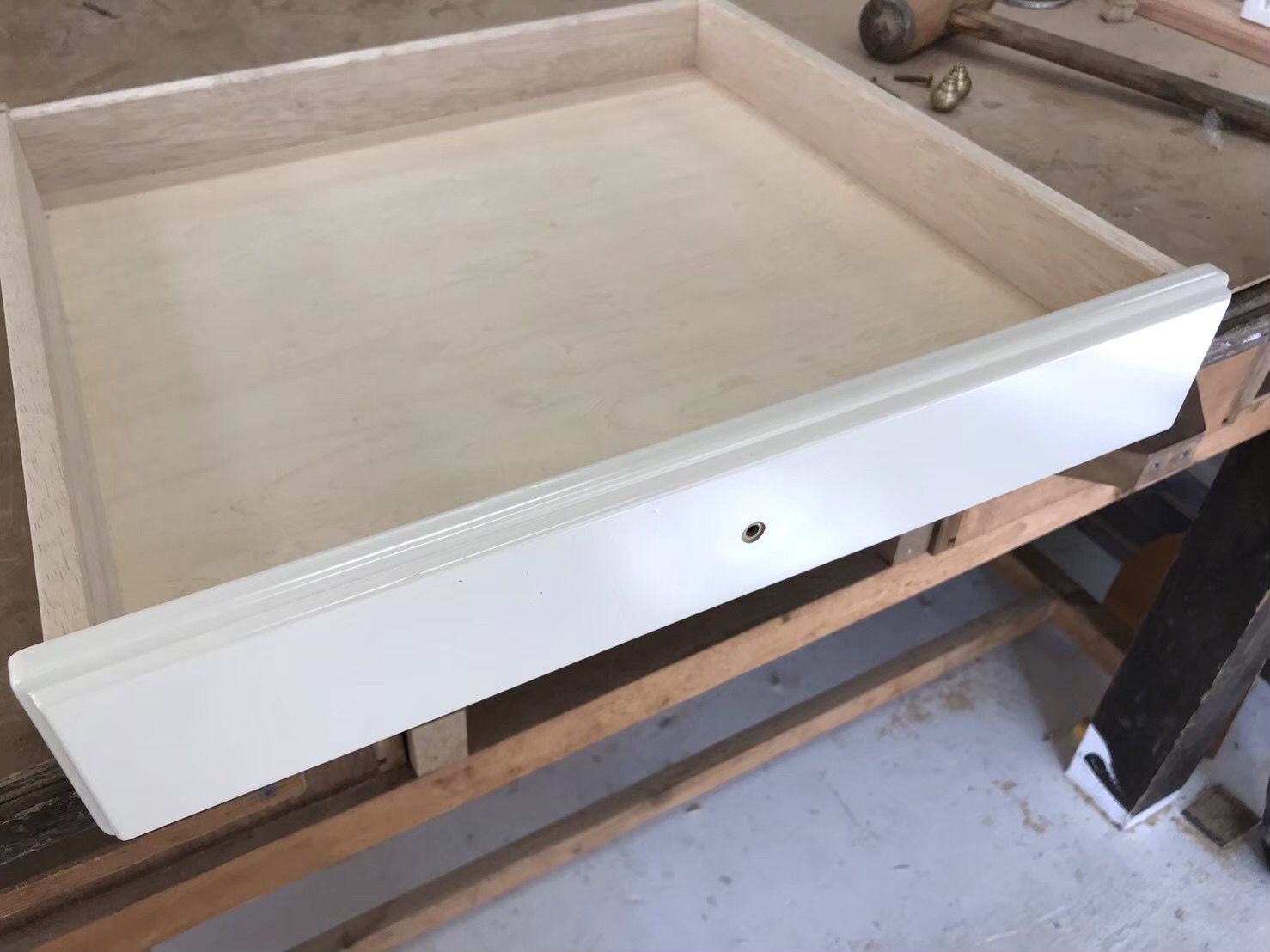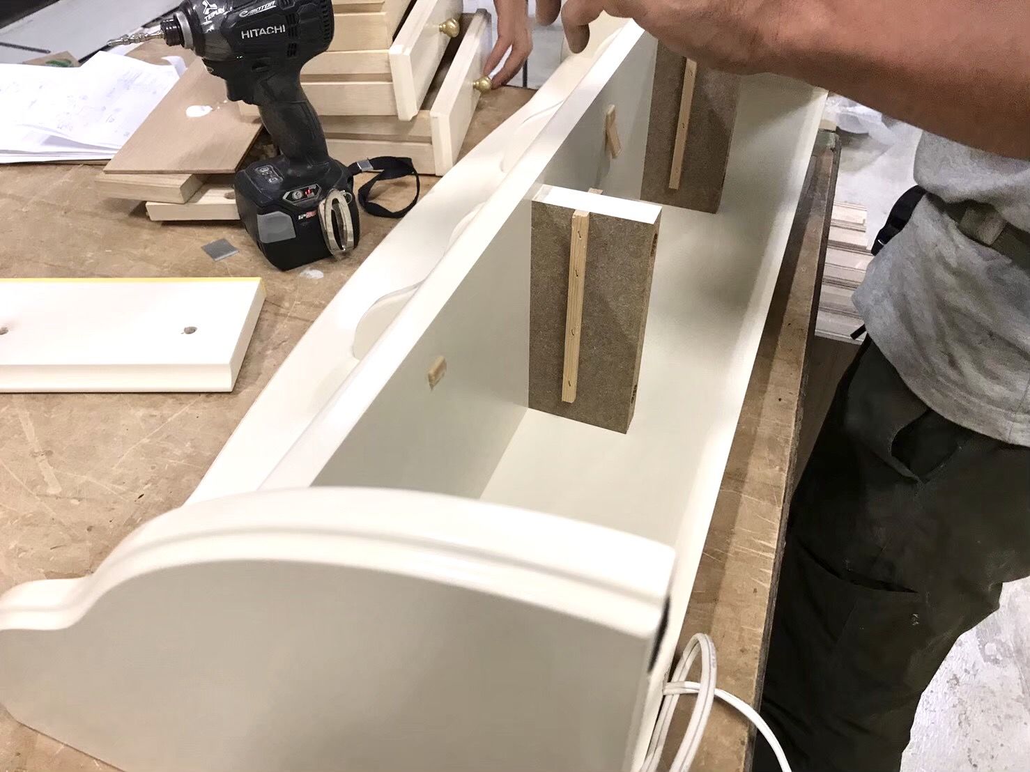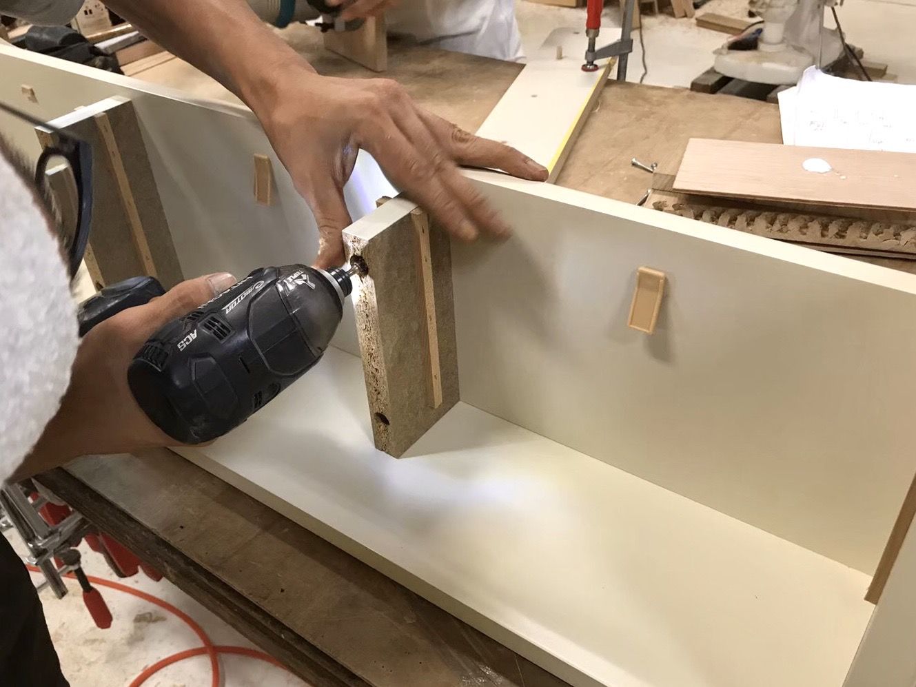 デスクの横幅を縮めるということは、引き出しもその中に収まるように横幅を縮めなくてはなりません。引き出しの横幅を縮めるということは、引き出し内部のカット、そして前板のカットをしなくてはなりません。