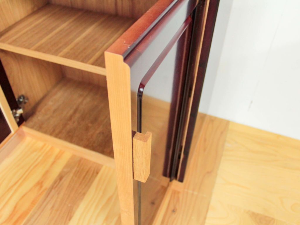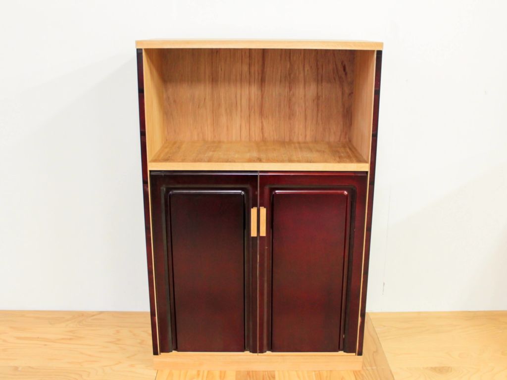 婚礼タンスの美しい赤紫褐色の部材がいきた素敵なキャビネットとなりました。