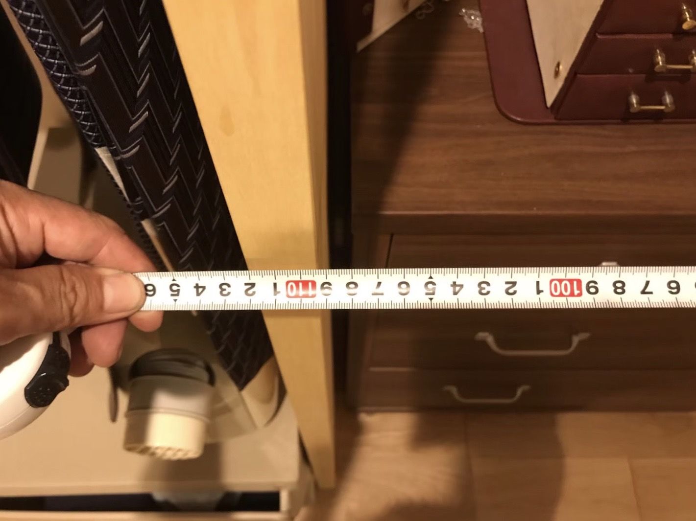 チェストが置かれているスペースの幅は、この通り1090mm程度。和タンスの幅が1209mmだったので、10cm以上縮めなくてはいけません。