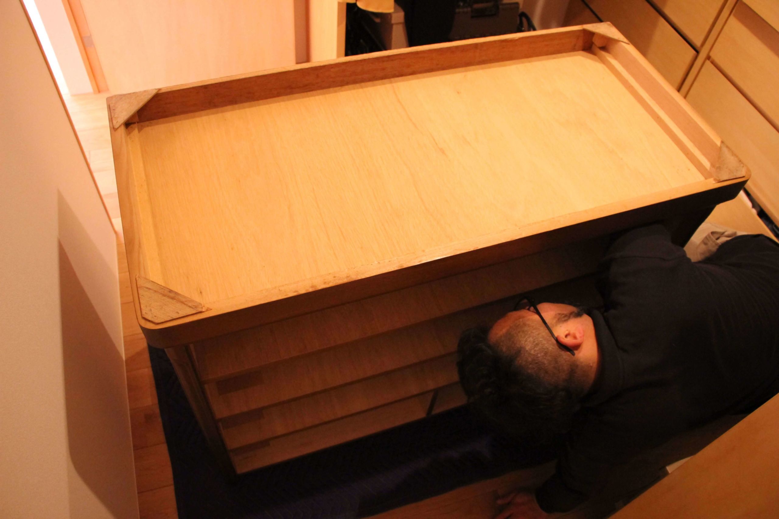 だって、本当に全部バラバラになっているんですよ!天板や台輪はもちろんのこと、引き出しを支える棚板とかも。