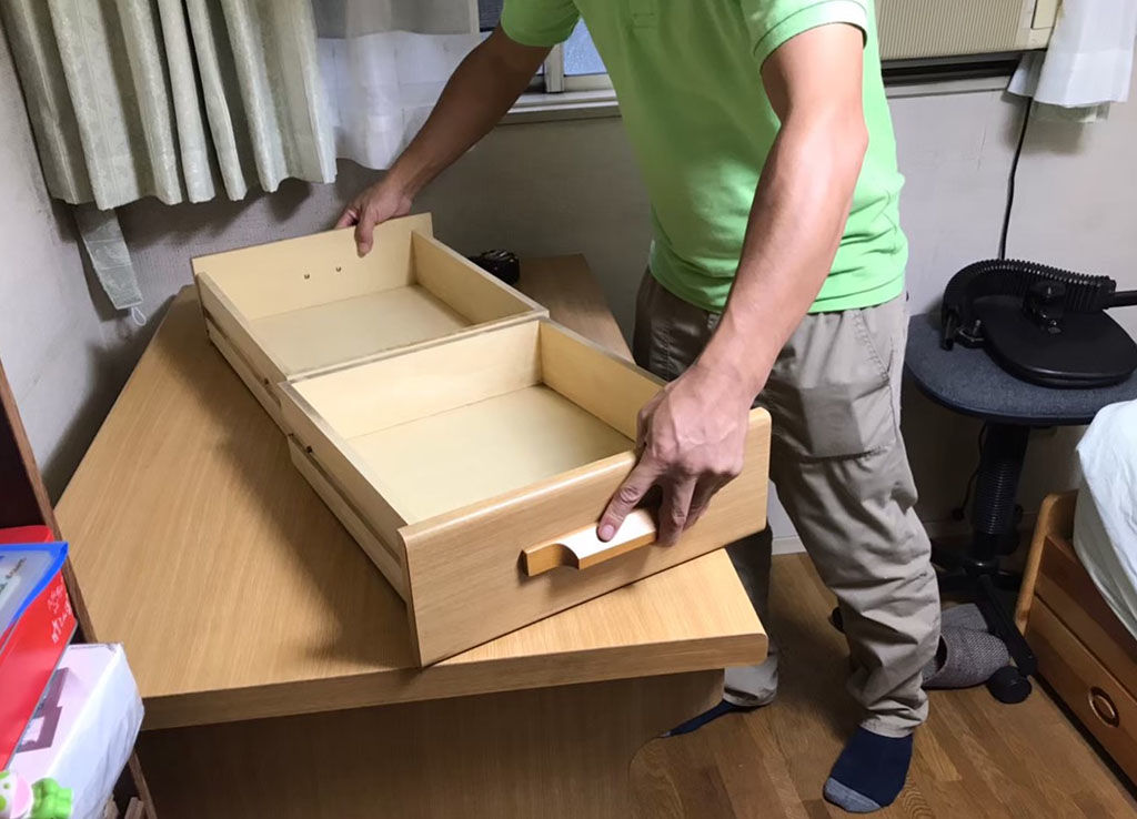 「学習机の天板をリサイズして、天板下に引き出しを背中合わせで取り付けるのはどうでしょう?」