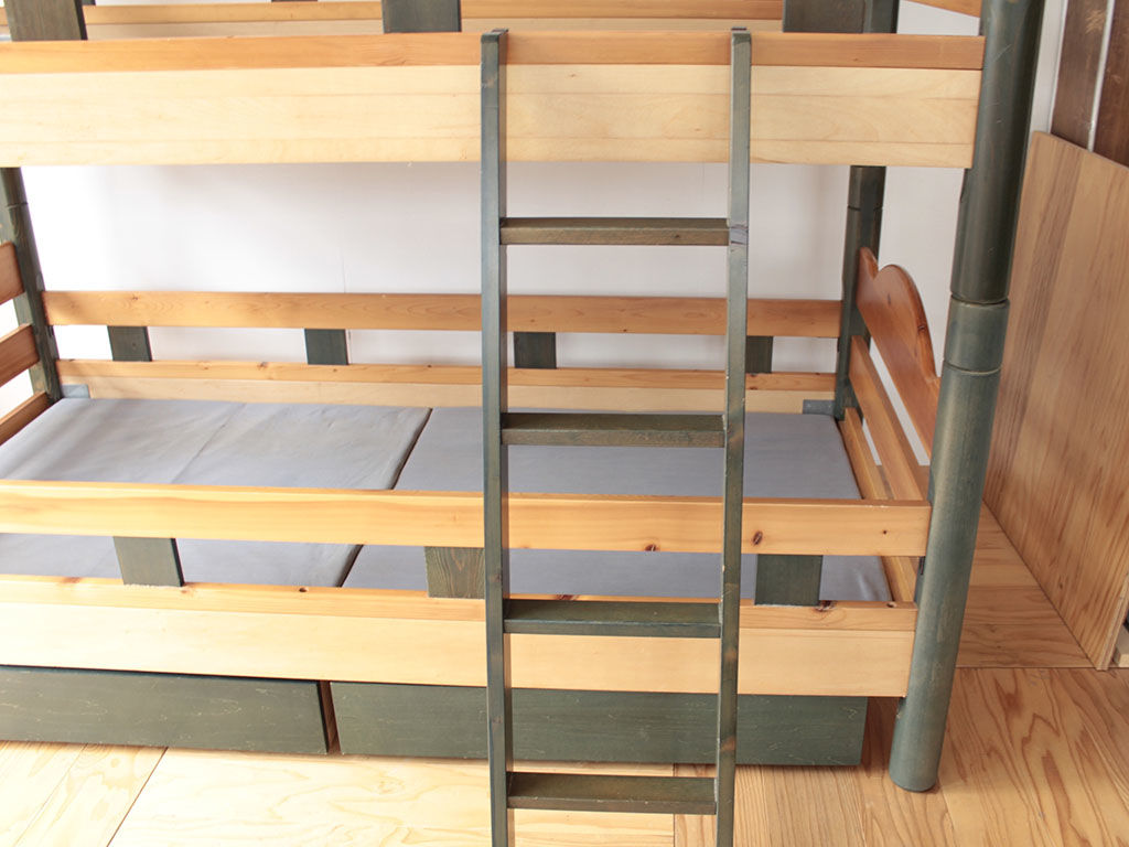 はしごを2分割にカットして、天板にベッドの部材を加工したものを取り付け仕上げました。