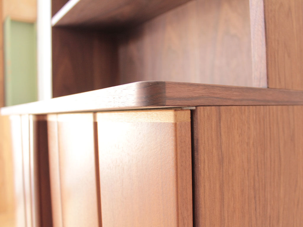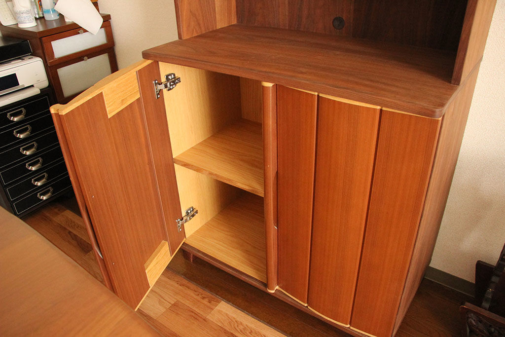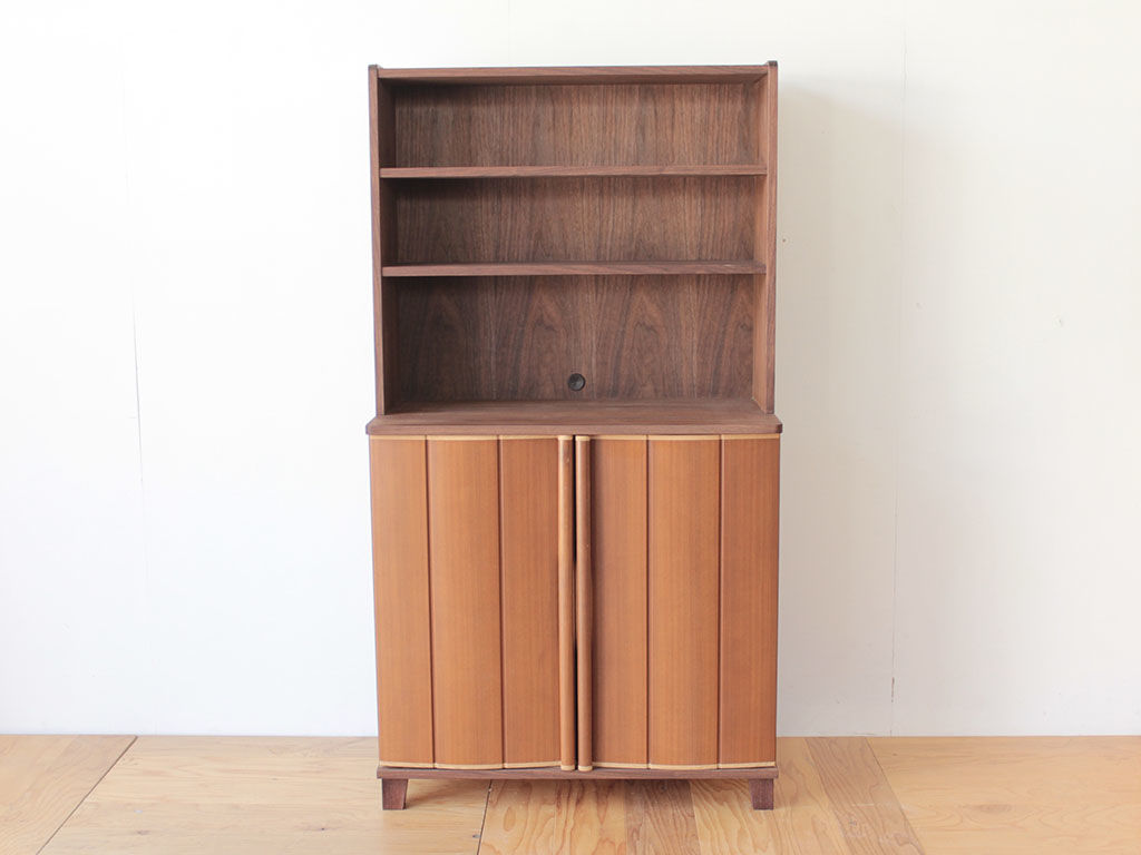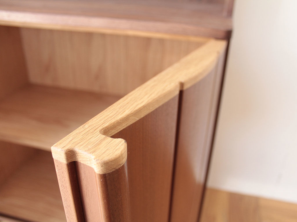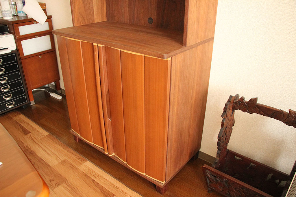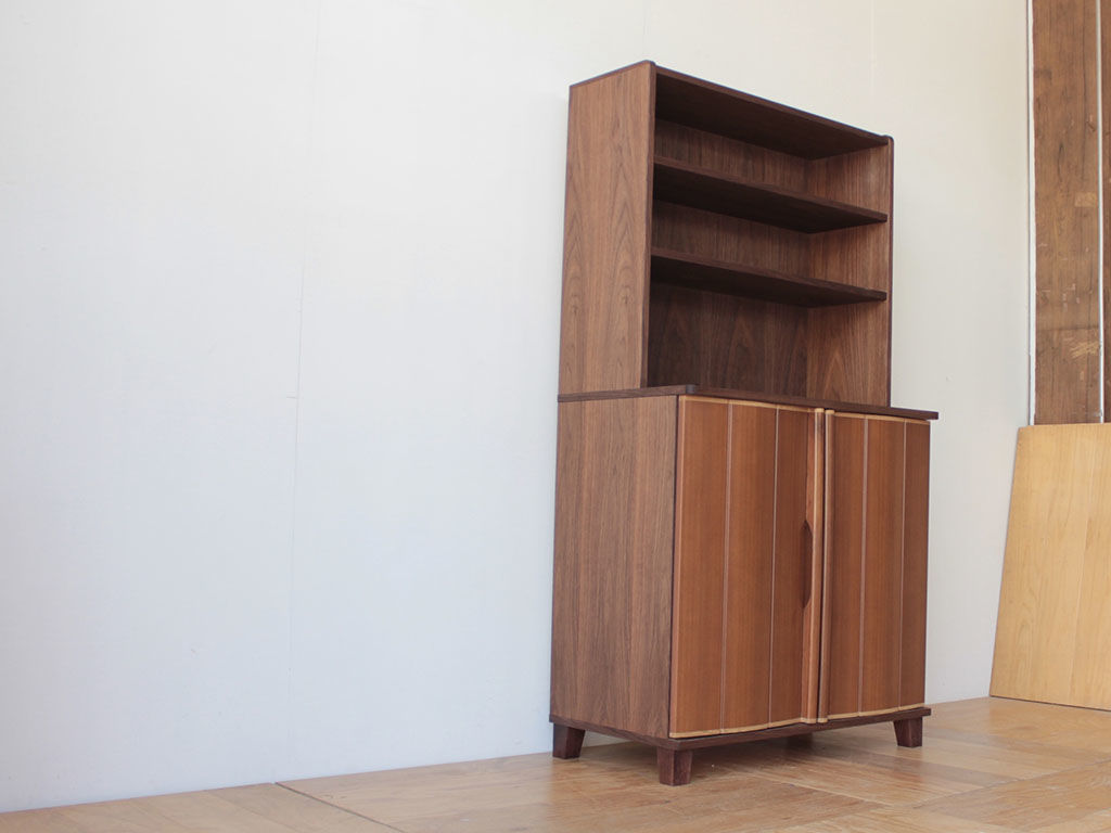 婚礼タンスの扉をリサイズしてキャビネットの開き扉に仕立て、本体はお客様がお使いの他の家具を拝見しながらお好みを伺って、ウォールナット材で製作しました。