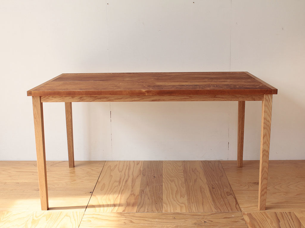 そうして、板材のリサイズ(W1840 D910 から W1350 D800 にカット)、板材表面の味わいを残しながらの美装、そして脚フレームの製作&取り付け・・・フルコースでさせていただき、出来上がったダイニングテーブルはこちら!