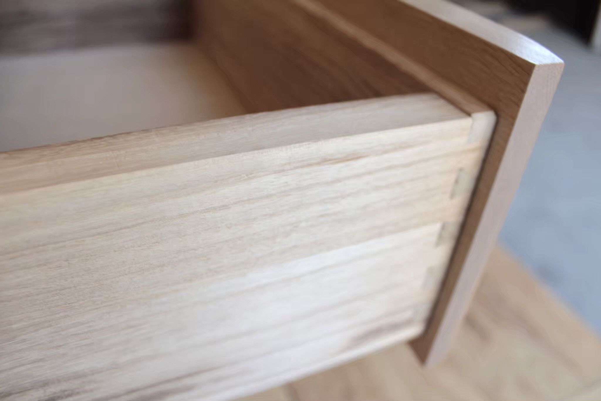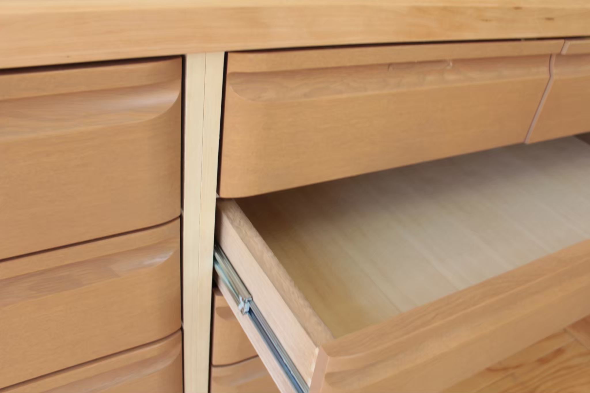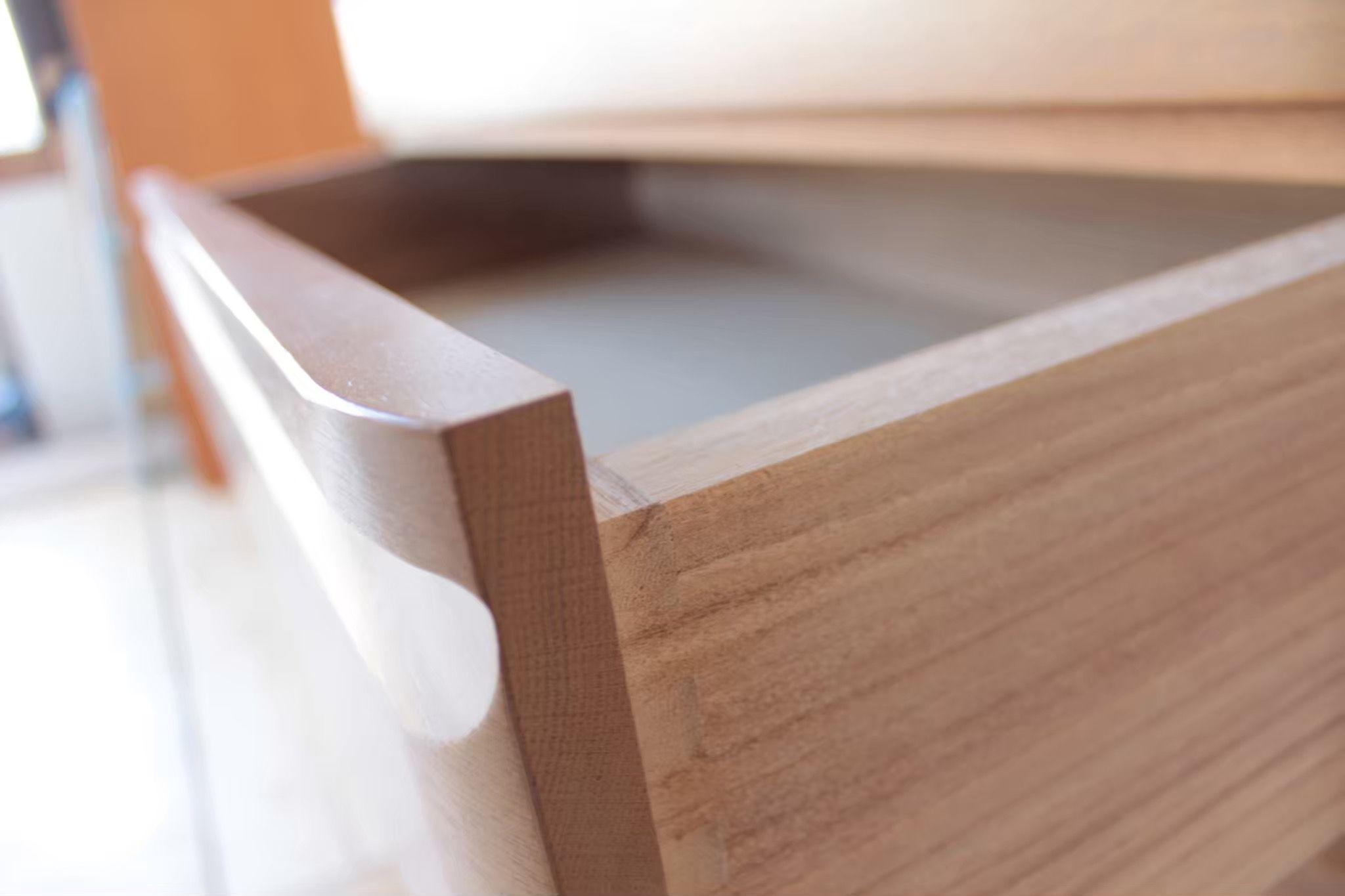 小さな引き出しと大きな引き出しを組み合わせているこちらは、全てにスライドレールを取り付けると横幅が揃わなくなってしまうので、小さな引き出しにはサイドに溝を掘って木製のレールを入れて寸法を合わせました。