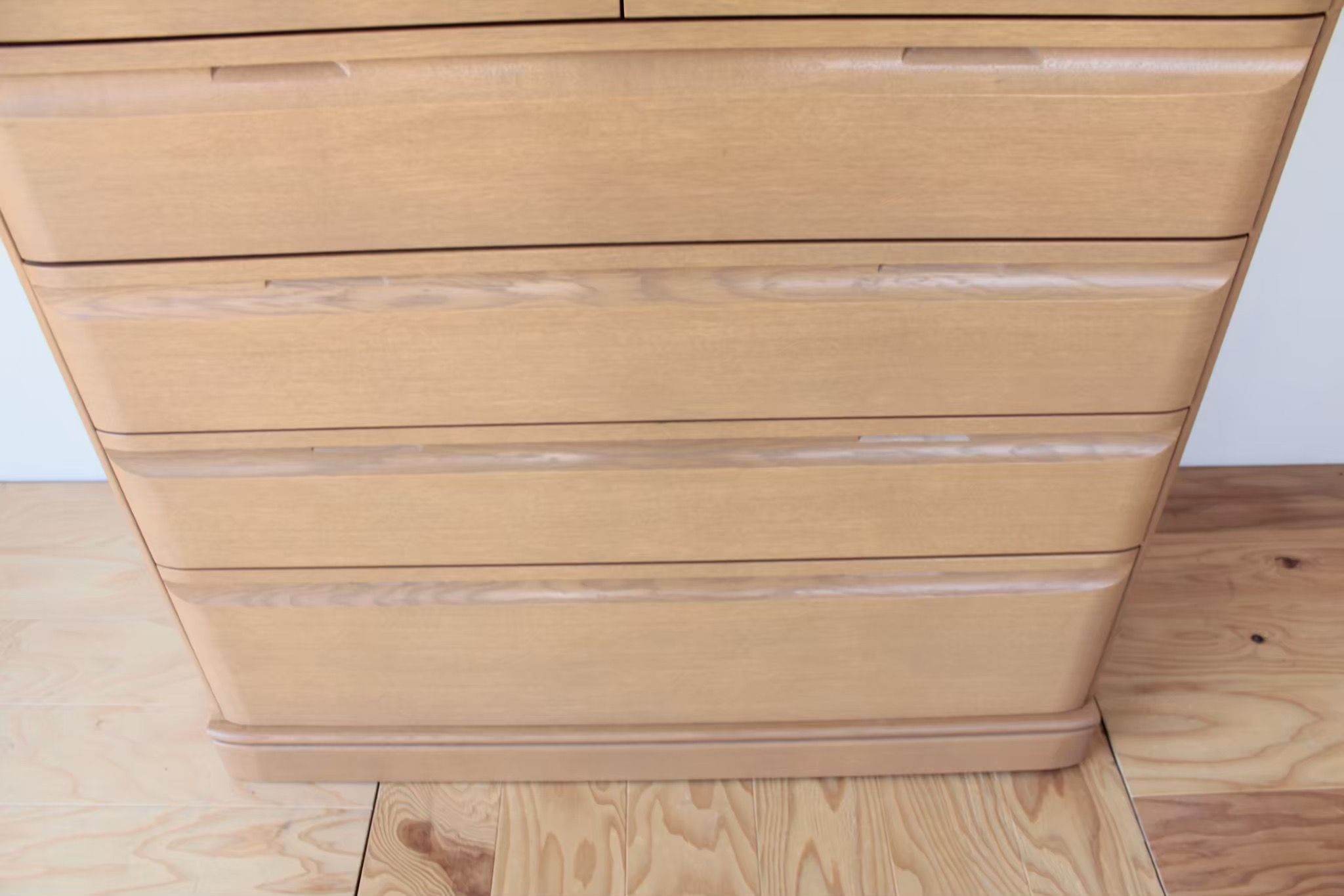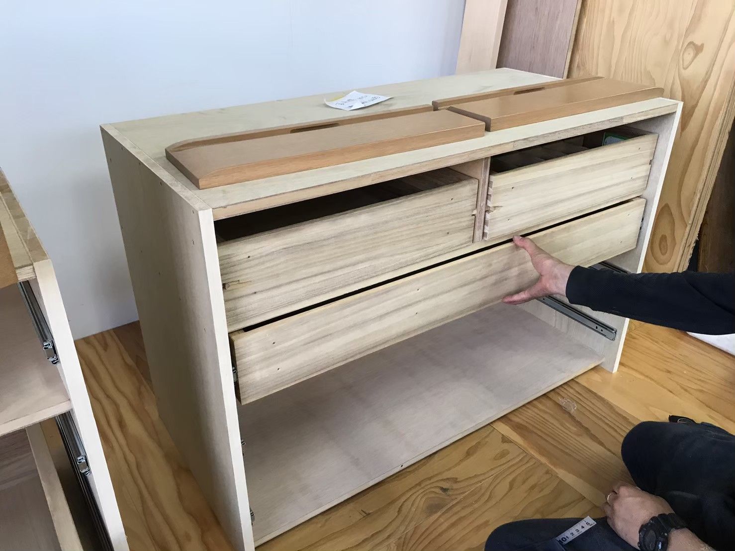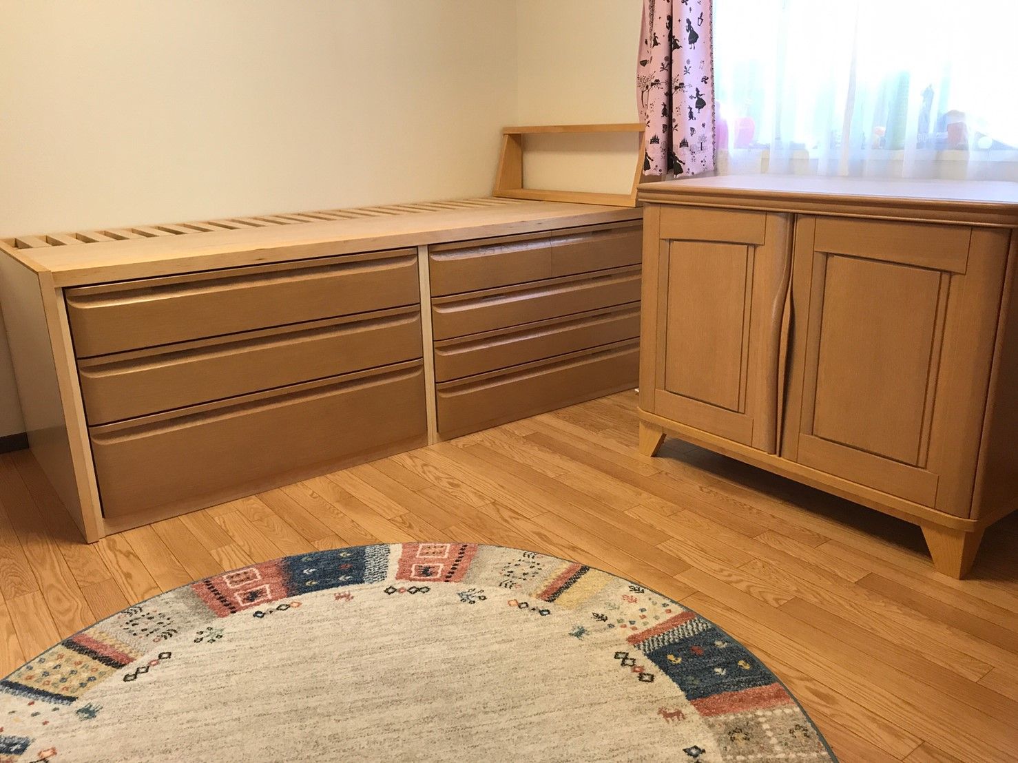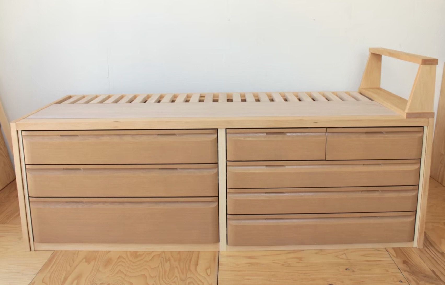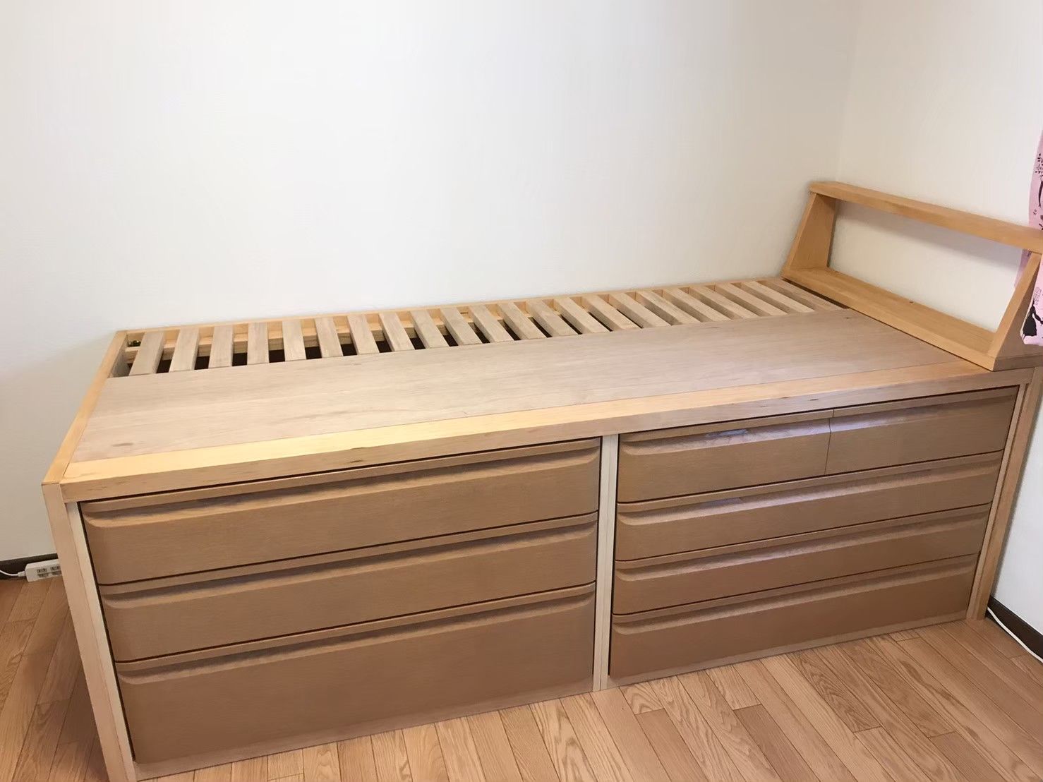 内容としては、当初お客様からご希望いただいていた通り「引き出し部分の高さを2分割する」なのですが、その分割した2つのタンスを並べてベッドにするのだといいます。