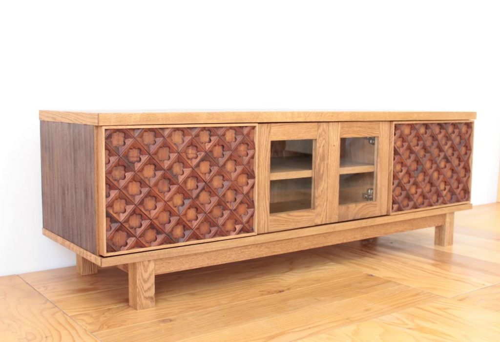 (婚礼タンスの扉や側板を使用しながら、オーク材を枠などに用いて製作したテレビボード)