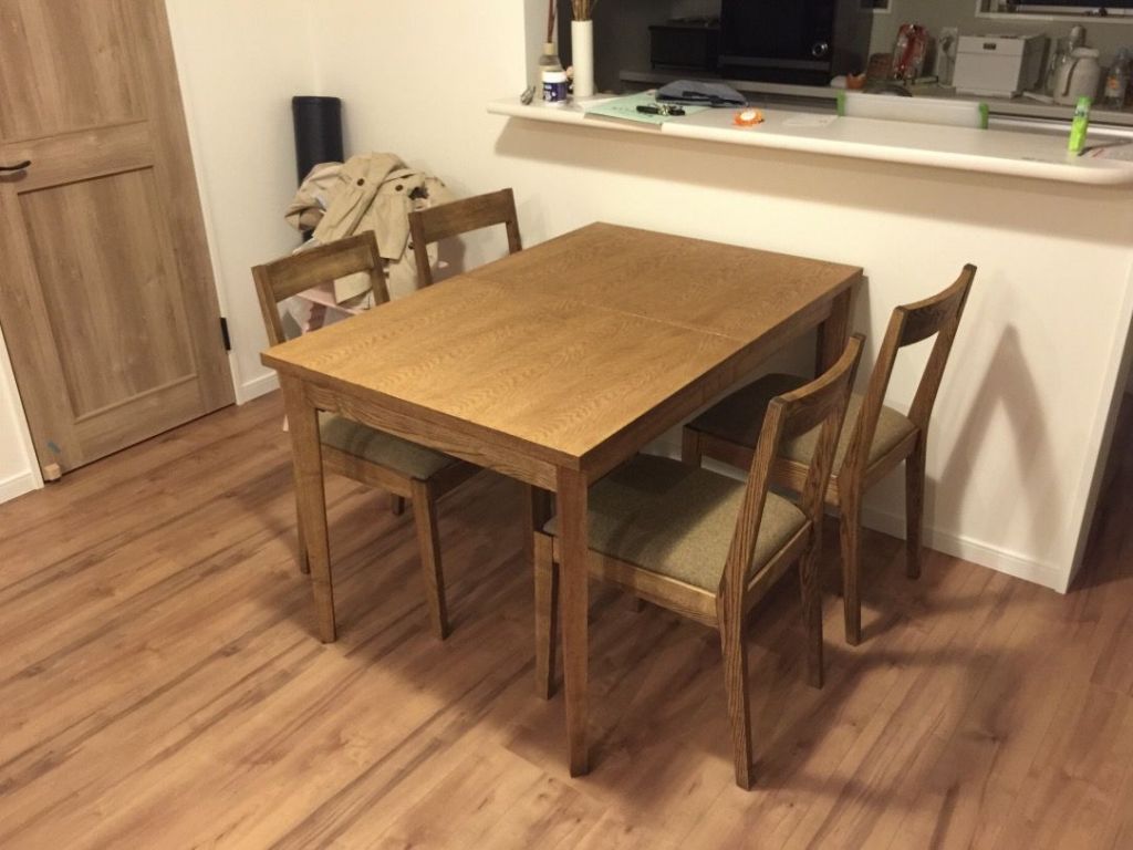 お客さまのお引越し先の内装に合わせて、ナチュラルな木目を生かしたダイニングチェアにリメイクしました。座面も合わせてグリーンを選択。