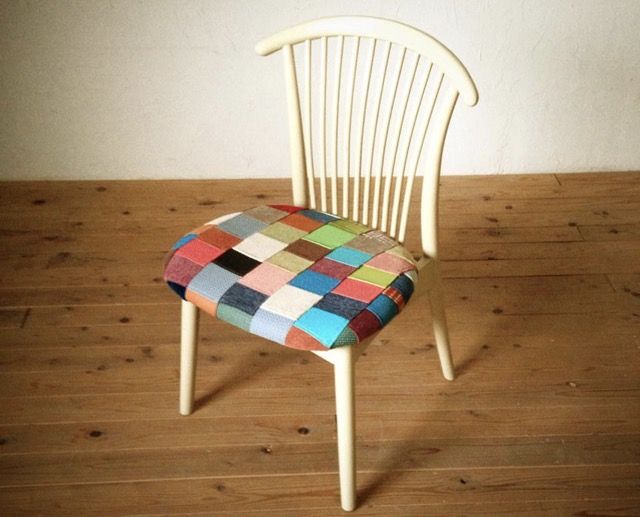 色々なカラーを組み合わせたツギハギファブリックで、POPな椅子にリメイクしました。