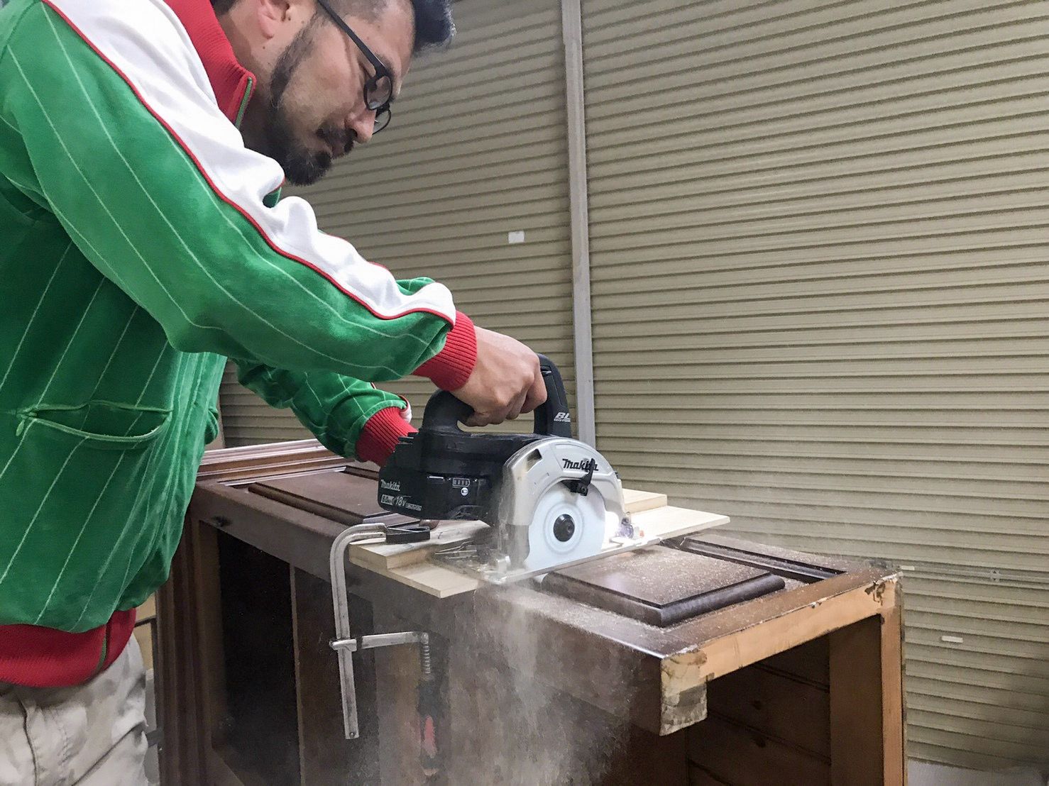 さて、今回はどのように加工したかというと、大きすぎて工房の木工機械に通すことができなかったので、本体を回しながら丸ノコでカットすることになったそうです。