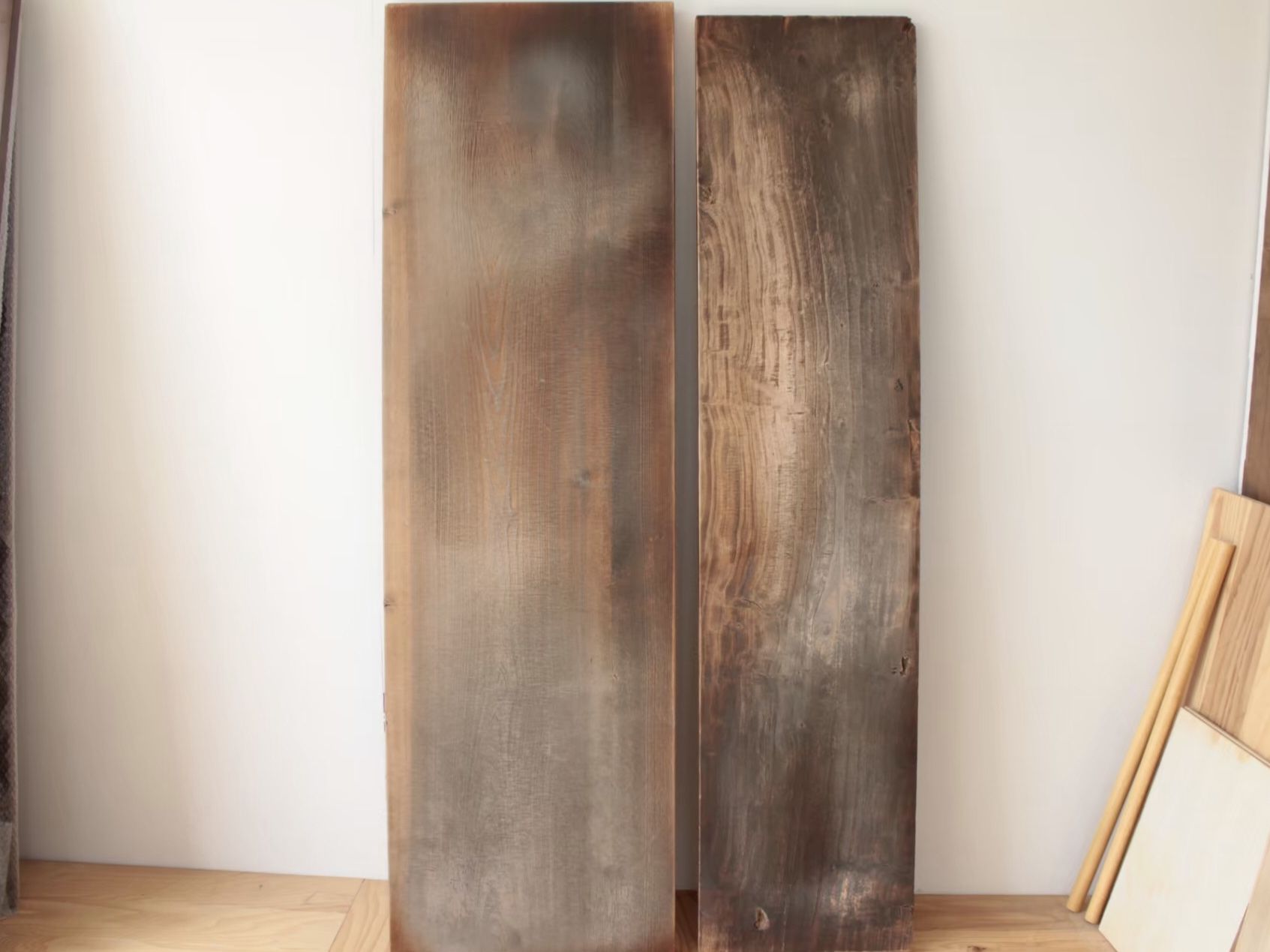 お預かりしたのは、長さ180センチ以上ある無垢一枚板の作業板を2枚。丁寧に使い込まれ、味わい深い表情です。