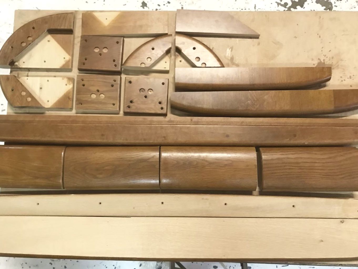 カットした脚の下部や天板の端や裏側の補強材などが残っていますね。穴が開いたり小さかったりで、この中で使えそうなのは脚の下部と天板の端の部分の一部です。