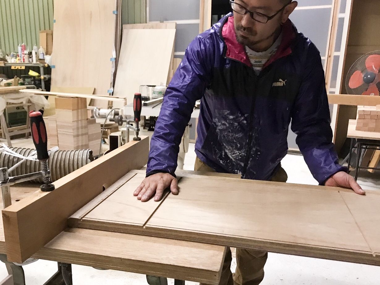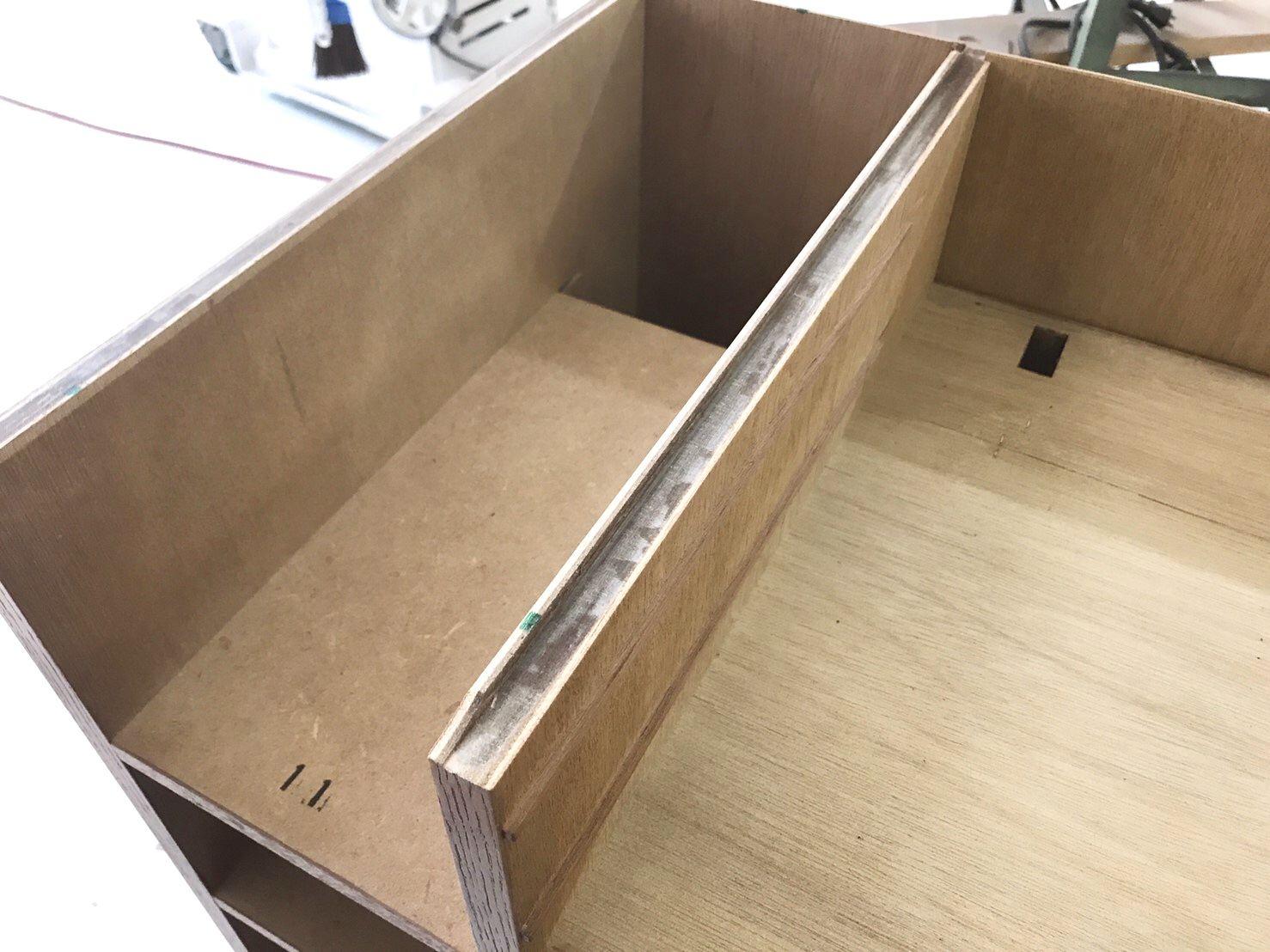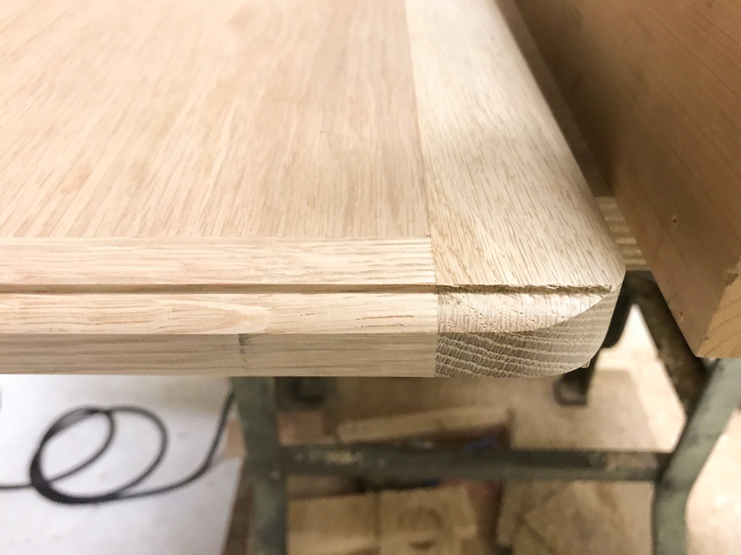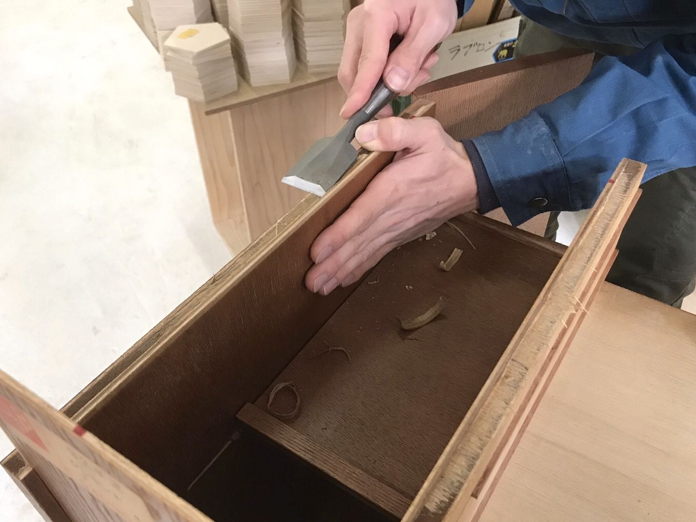 ドレッサーの天板はサネ(木材と木材を継ぎ合わせるときに、それぞれに凹凸を施して噛み合わせる加工法があり、その際の凸型の突起をサネといいます。)で入っていて、それに合うように新しい天板側をほり込む工程がとても大変でした。