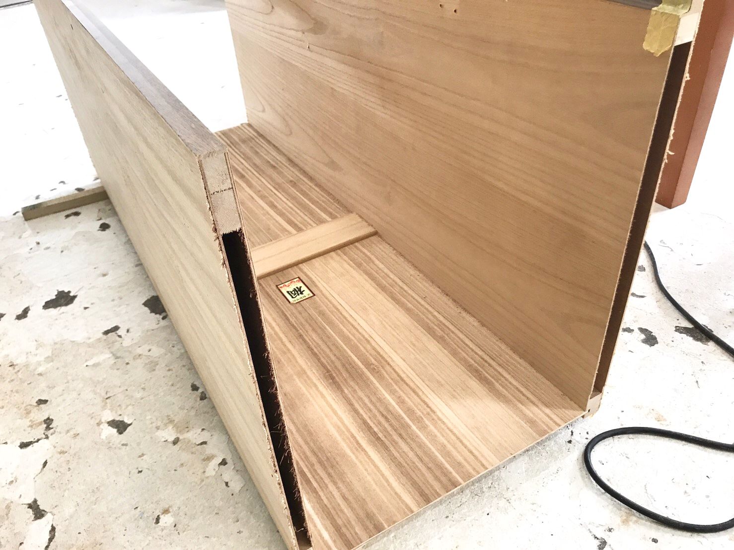 今回、高さを抑えたり強度を保ったりするために、台輪構造から側板が床に接地するような構造に変えました。