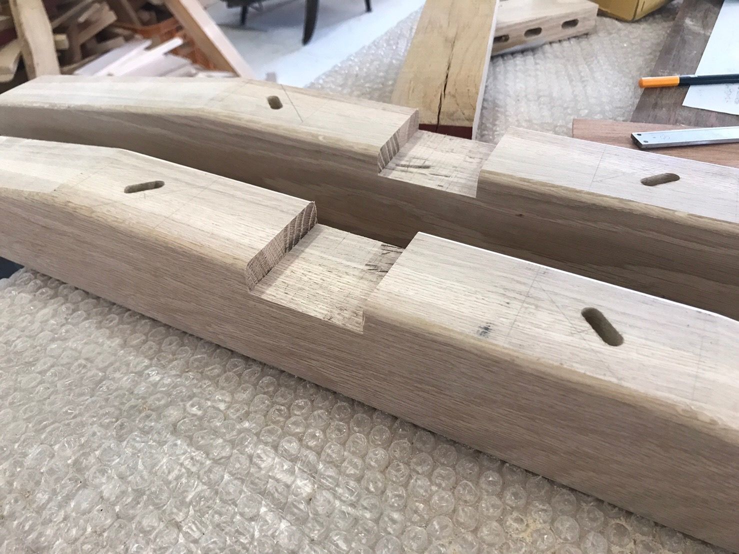 そこで、先に脚だけ完成させて、天板の取り付け穴を納品の際に現地で開けて、金物を仕込むことにしました。