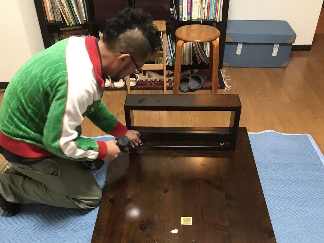 お客様のお宅に到着したら、まずは天板から脚を取り外します。