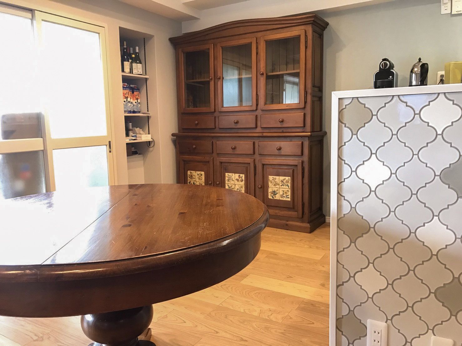 スペイン製でお揃いの食器棚とテーブル、並べて置くととっても素敵ですね♪どちらのリメイクも喜んでいただけて何よりです。