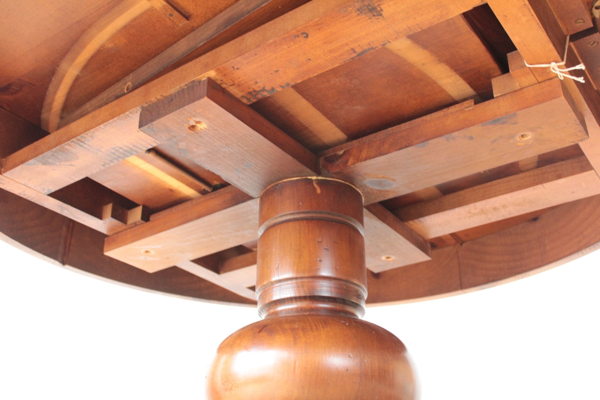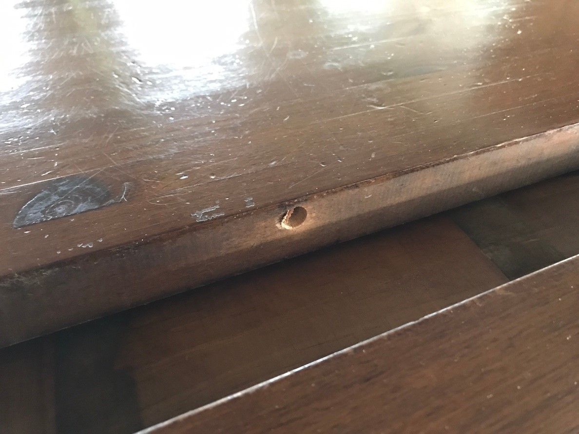こちらは、テーブル中央を開いて天板の大きさを拡張できるエクステンションテーブルなのですが、天板を固定するためのダボが取れ、金具も取れ、開いて使うことができなくなっていました。