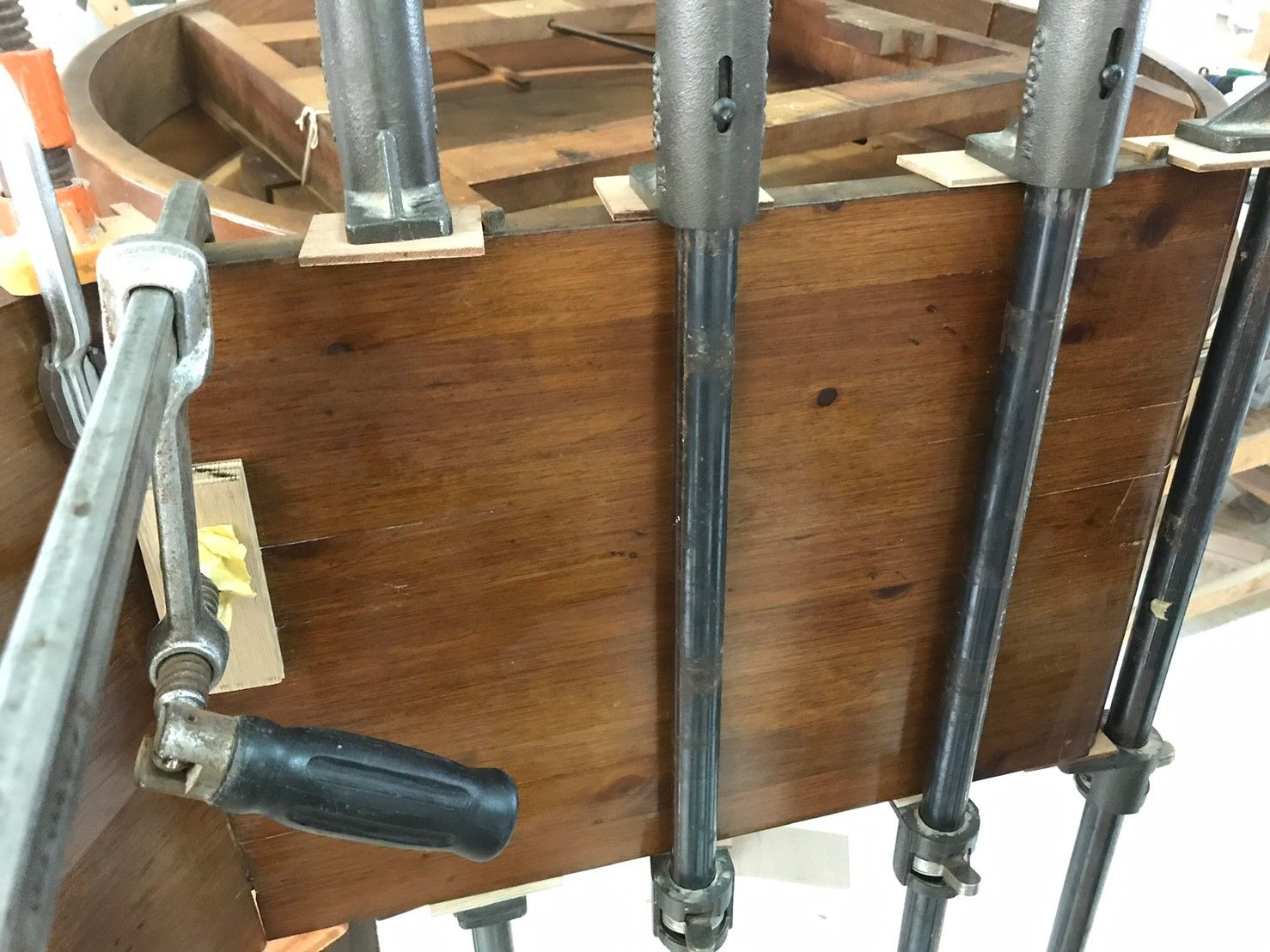 ところで、今回目立って修理が必要なのは外れてしまったダボや金具についてのように思えますが、実は天板の拡張用の板も反ってしまっていました。