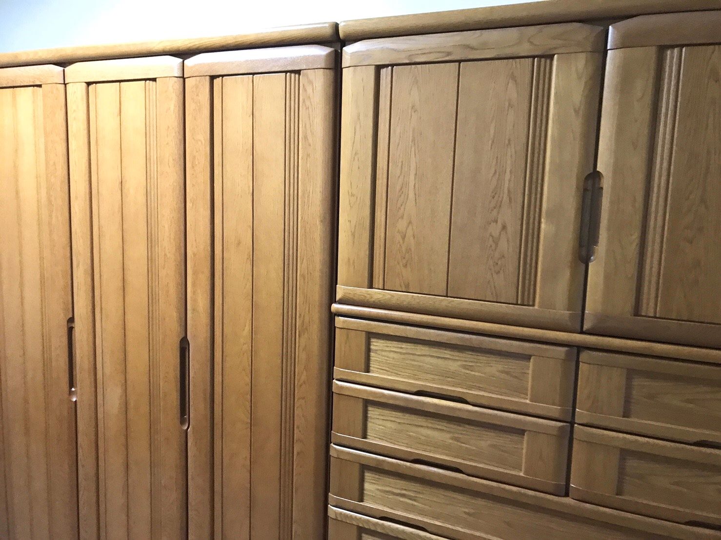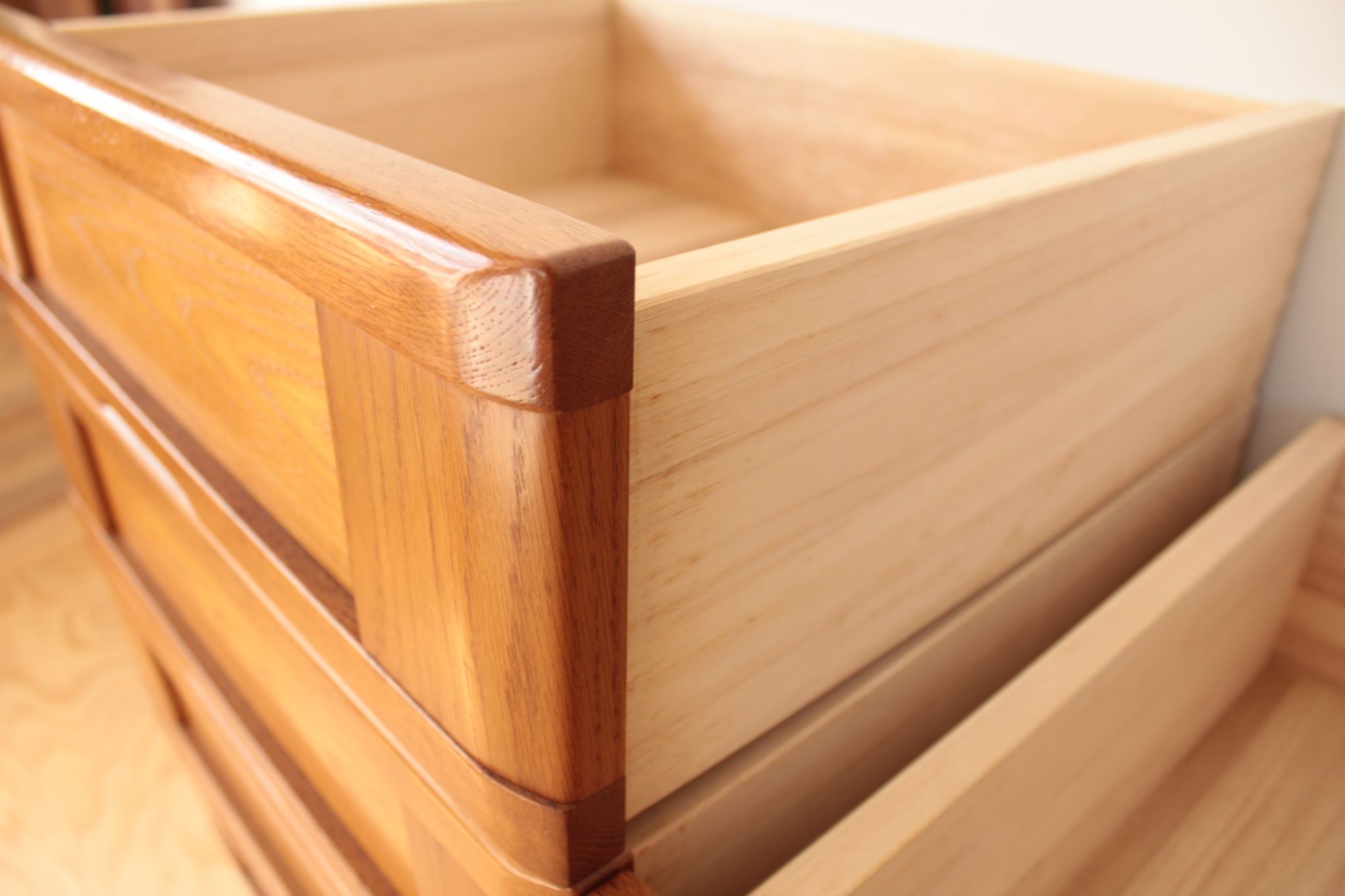 お客様の婚礼タンスの扉や引き出しがウォールナットやオークと組み合わさることで、上品ながら可愛らしさもたっぷりと持ち合わせた仕上がりに!個人的には、ウォールナットってどこかクールなイメージがあったんですけど、こんな風にやわらかな表情を見せるなんて驚きでした。