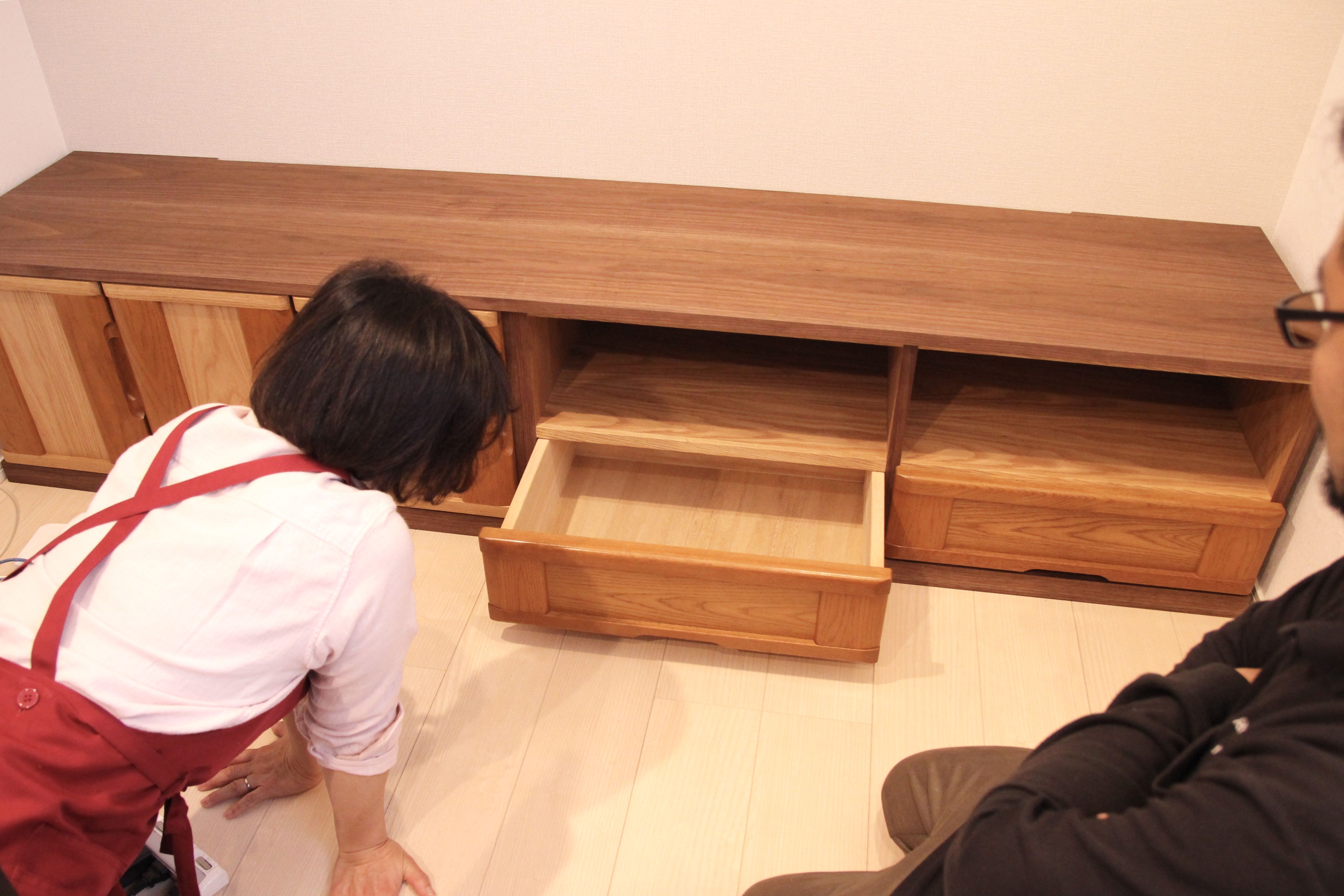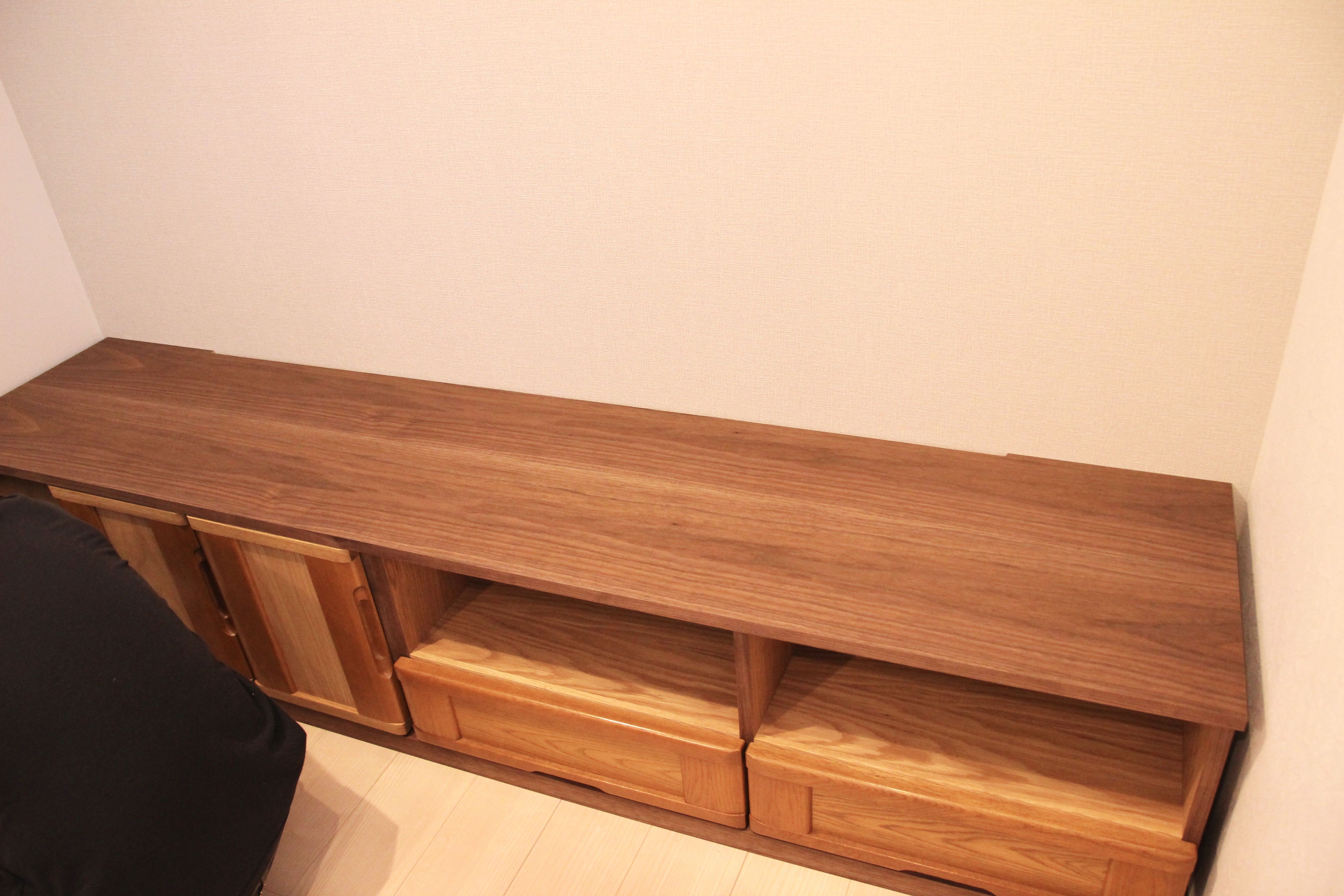 思い出の婚礼箪笥、ウォールナット&オークを掛け合わせテレビボードに