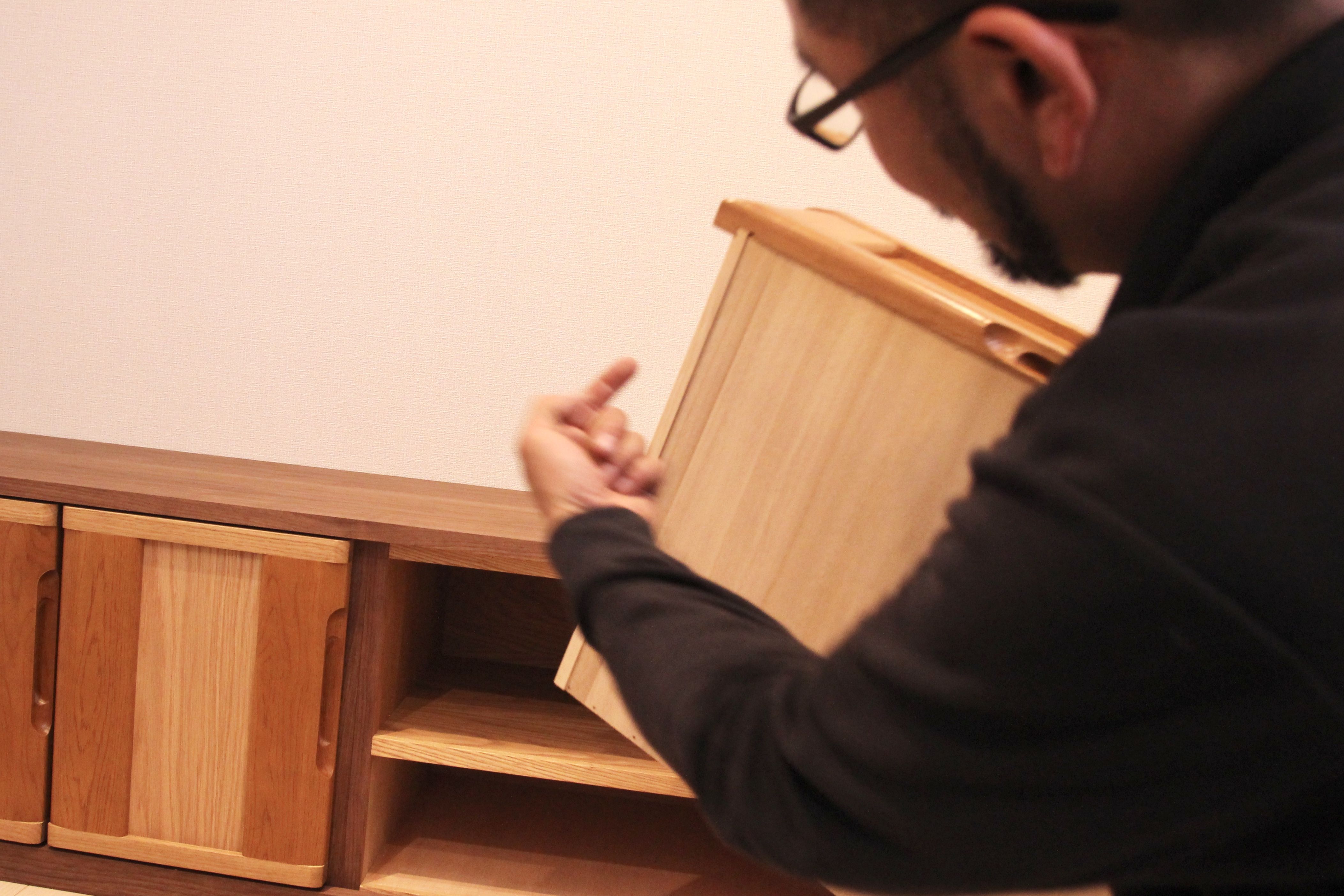 今回のテレビボードは、2つのユニットを現地で組み合わせ一体にするタイプでした。もしかしたらまたお引越しがあるかもしれないとのことで、搬出入のしやすい分解可能な形にしたのです。