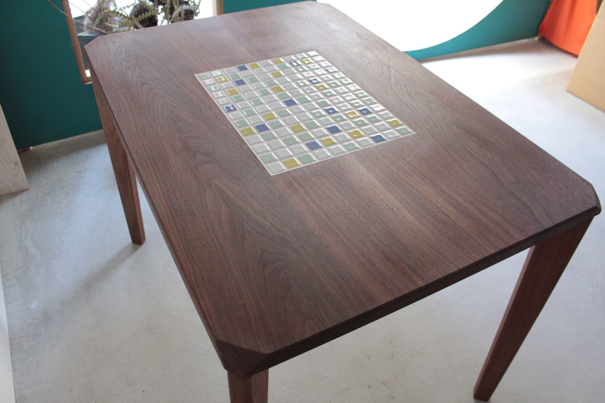 無垢ウォールナットの天板にモザイクタイルをはめ込んだオーダーメイドテーブル。タイルの配置面積や配色のバランス、欠き取りにした天板角など、さりげないようで細かいお客様のこだわりが生きています。