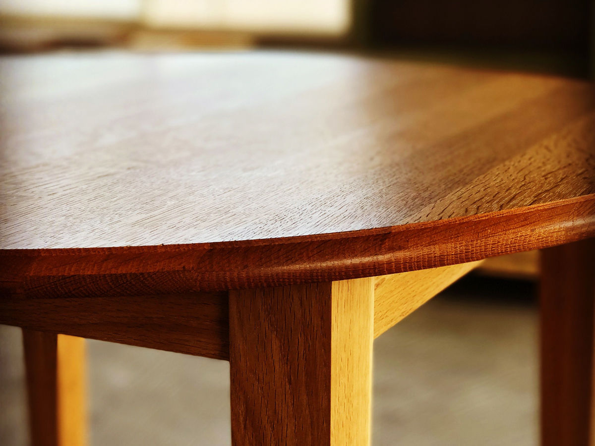 無垢ナラ材のローテーブルから、お客様のご自宅のインテリアに合わせて円形テーブルにリメイクしました。ダイニングテーブルのお色味に合わせて天板は濃色に、脚はコントラストを聴かせてナチュラル色に。