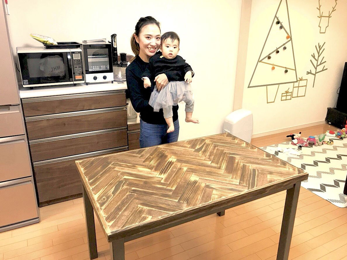 こちらのテーブル天板お客様の手作りなんです!すっごく素敵!木の素材感をいかしたヘリンボーンかっこいい!こちらの素敵なテーブルをなぜリメイクしたか?お客様がお子さんを出産されたことがきっかけ…