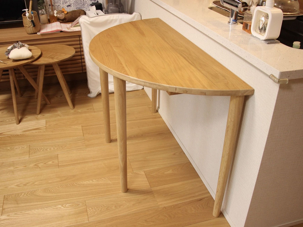 無垢オーク材のダイニングテーブルを2WAY仕様のキッチンカウンターにリメイク!幅1350mm×860mmの大きなテーブルを縦にカット、1350mm×375mmのテーブルを2台製作しました。