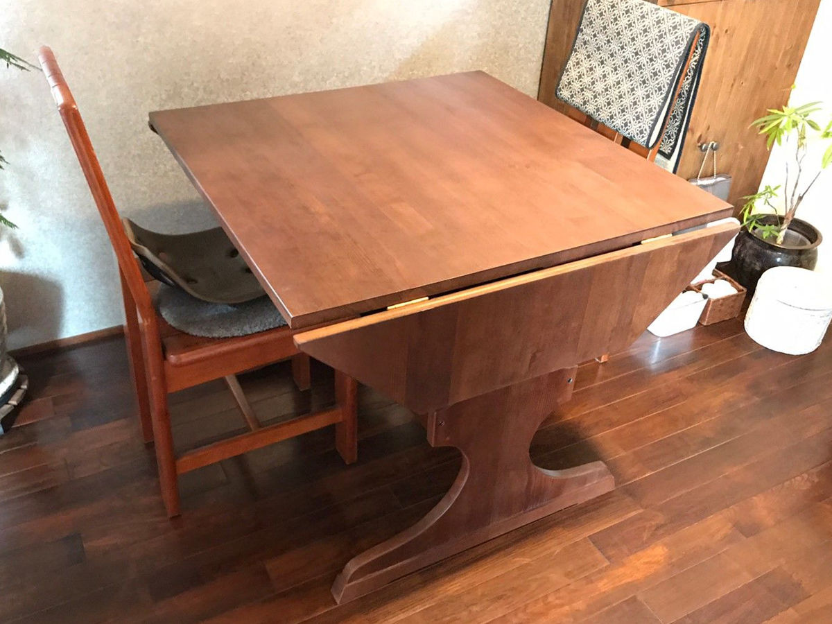 伸縮式ダイニングテーブルを機能はそのままひと回り小さく、セットのチェアもレストア