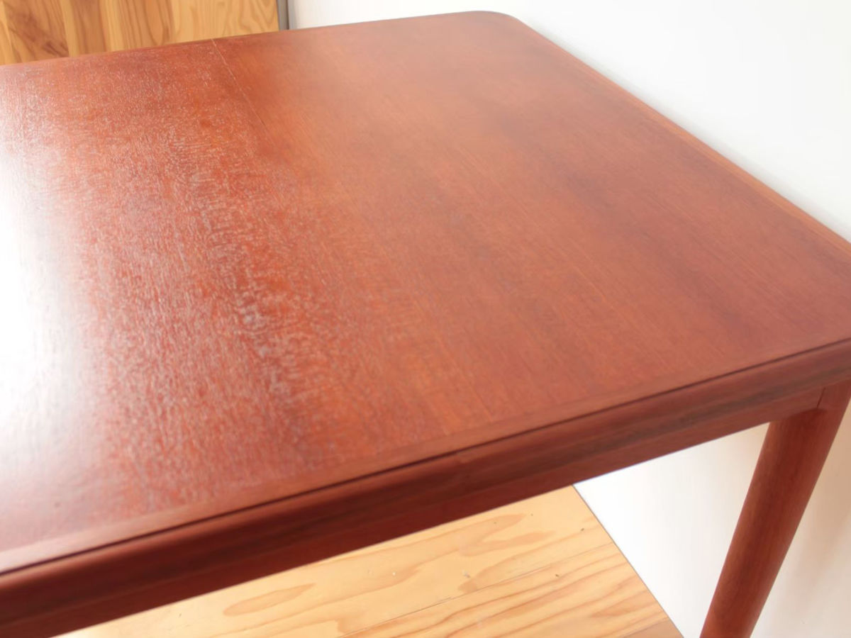 ダイニングテーブル天板のガタつきや、割れた脚を直した上で、高さも5センチ高くしたいというご依頼をいただきました。反りが出ていた天板はしっかりレストアした上で再塗装し、元通りの色味に。脚も本来のデザインを損なわない形で高さアップしています。